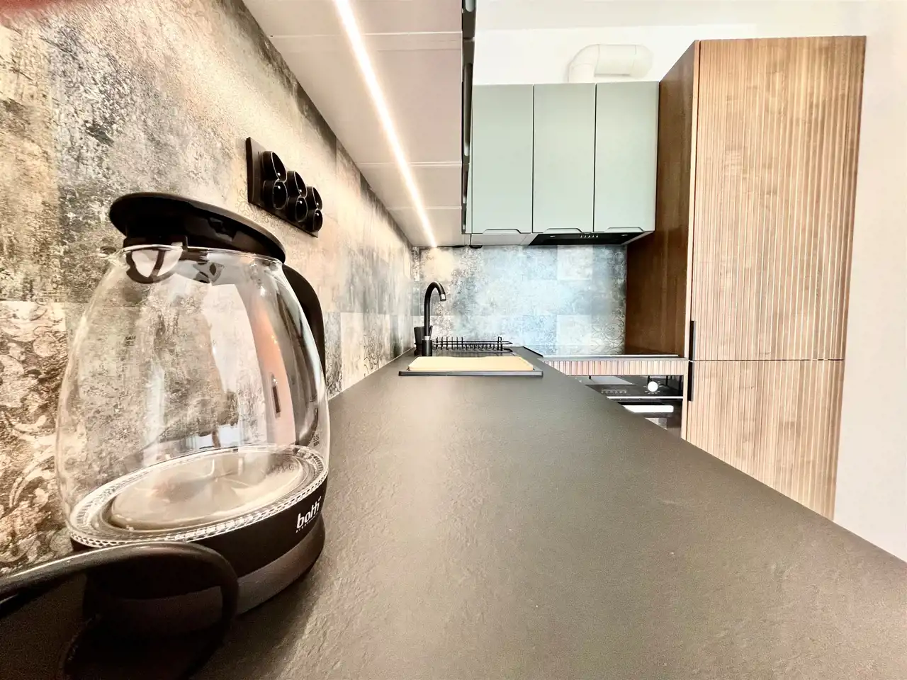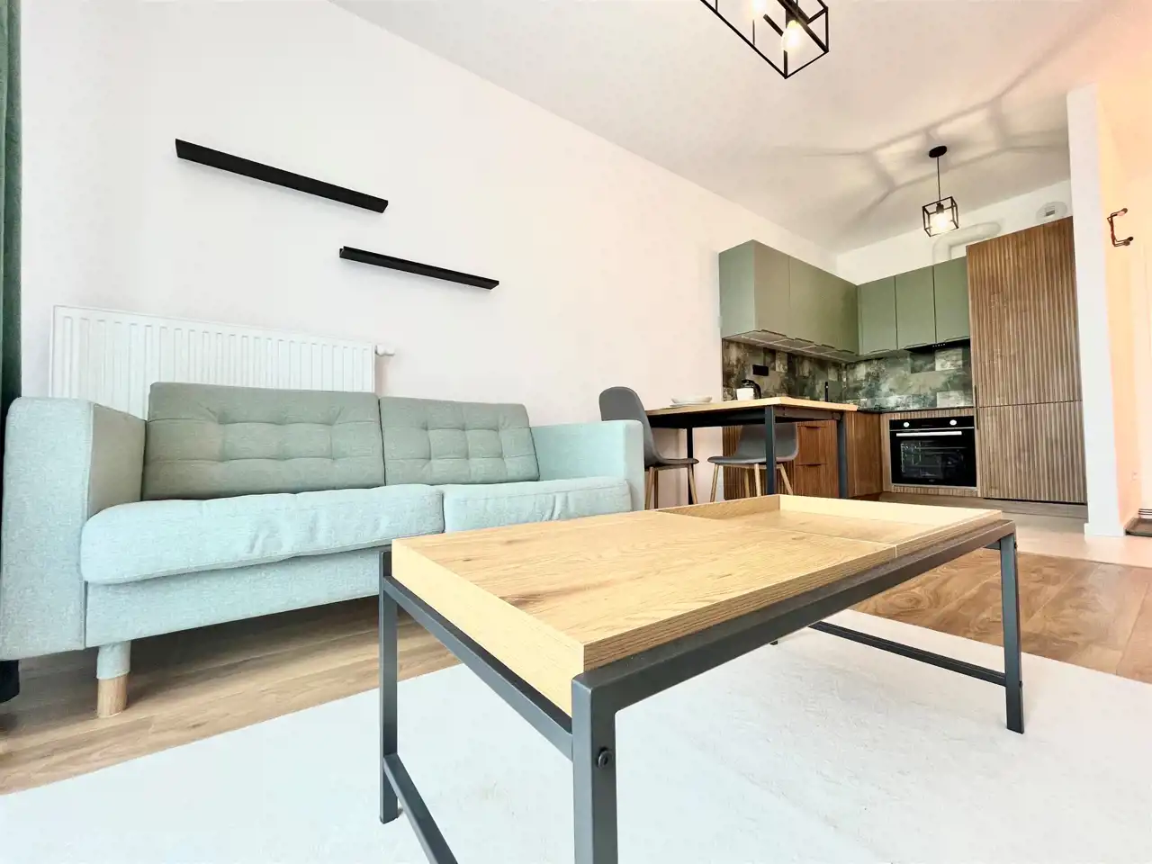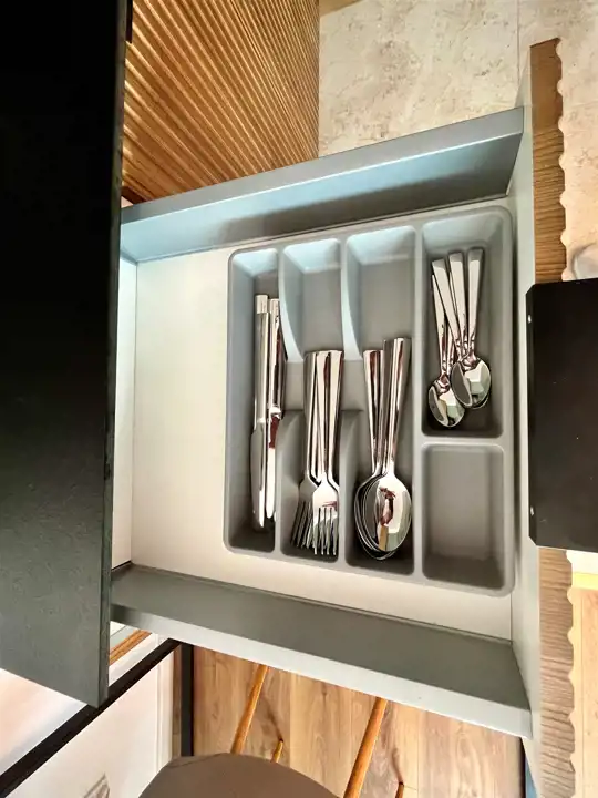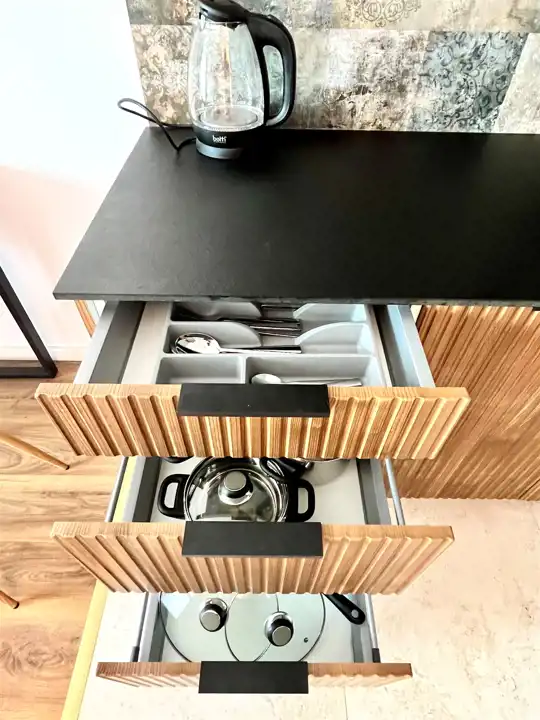 W salonie sofa, ława, stół i krzesła. Aneks z zabudową na wymiar wyposażony min w zmywarkę, zlew, płytę indukcyjną, piekarnik chłodziarko-zamrażarkę a także drobny sprzęt agd: czajnik, talerze, sztućce, garnki.
