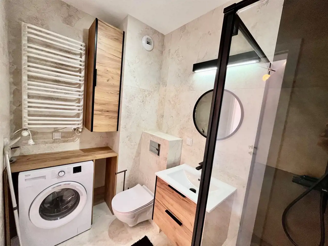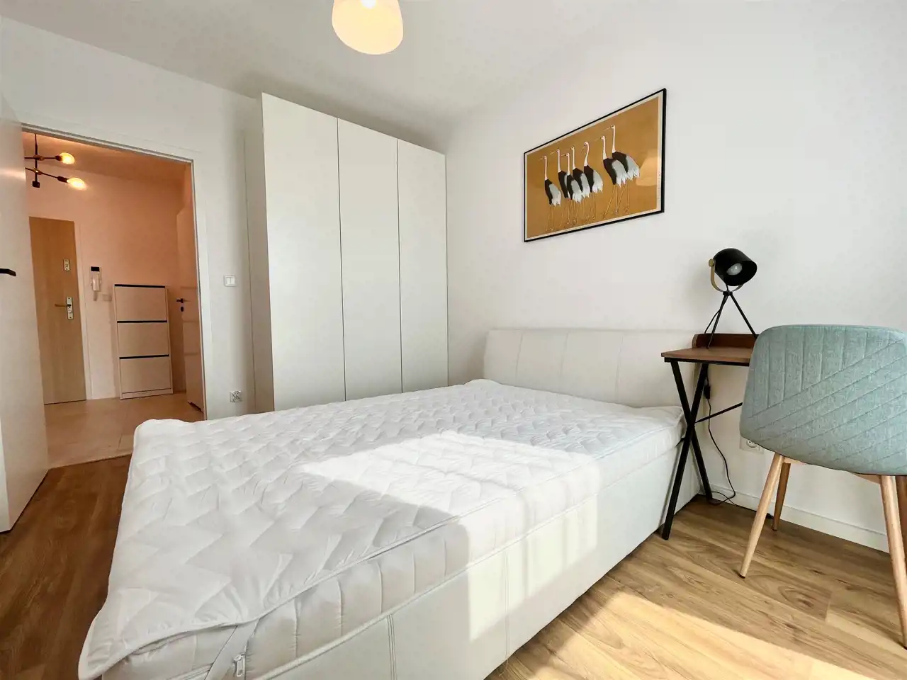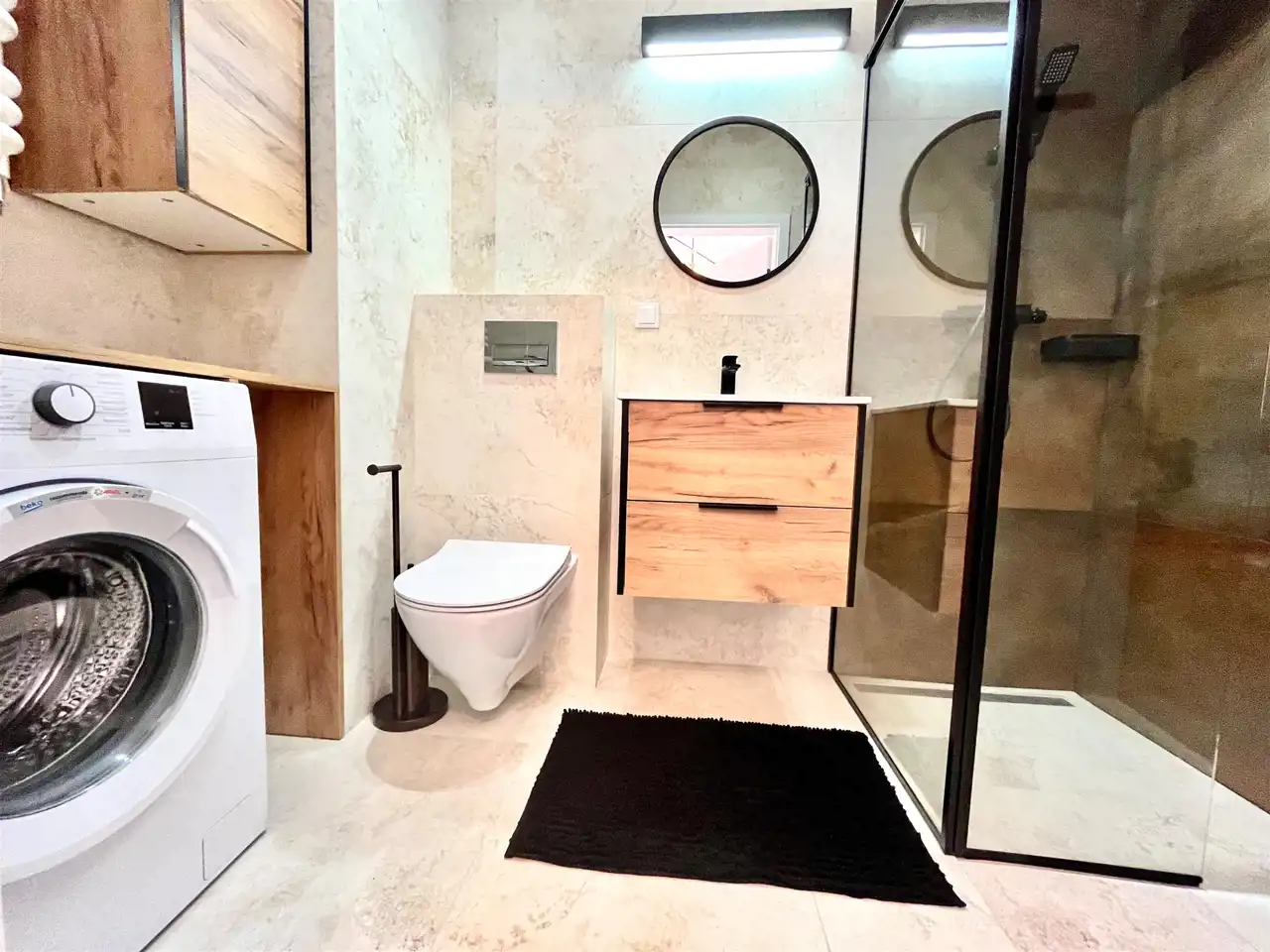 Sypialnia podwójnym łóżkiem i dużą szafą. W łazience szafki, pralki o nowoczesna kabina prysznicowa.