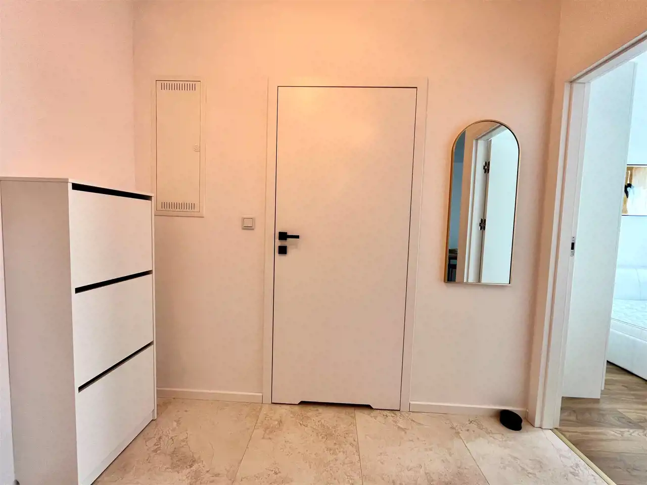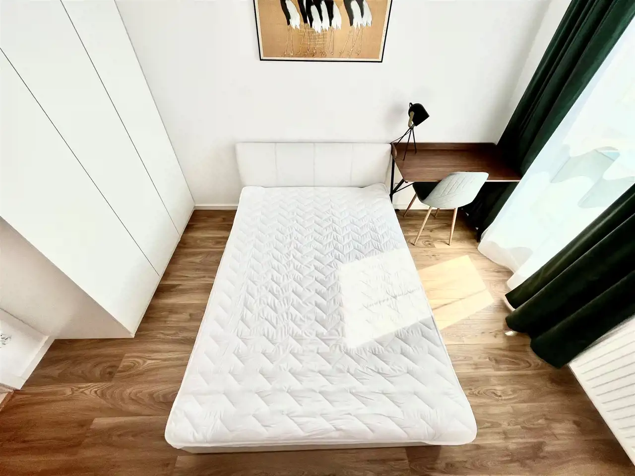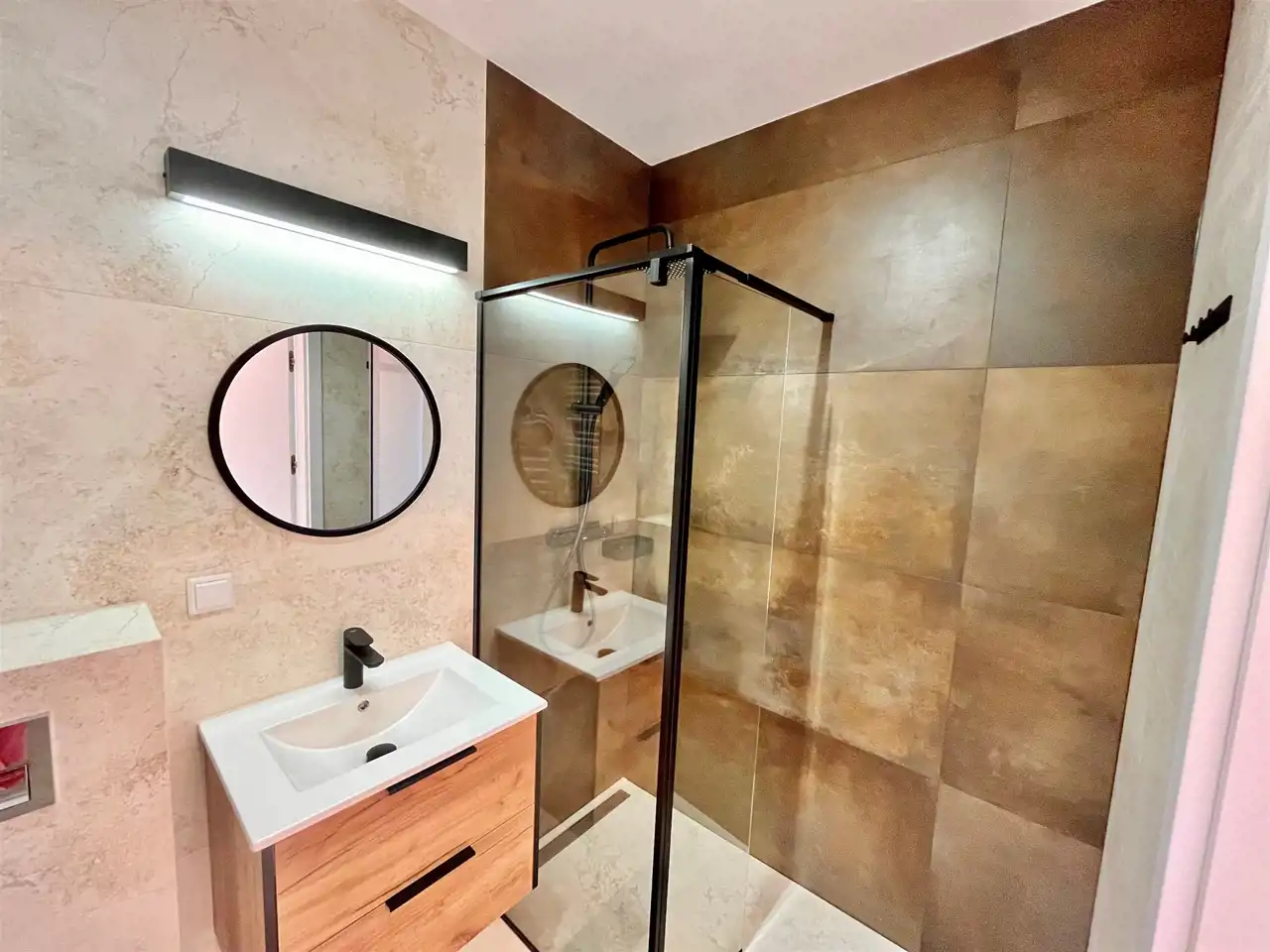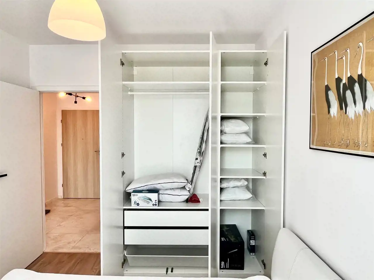 Sypialnia podwójnym łóżkiem i dużą szafą. W łazience szafki, pralki o nowoczesna kabina prysznicowa.