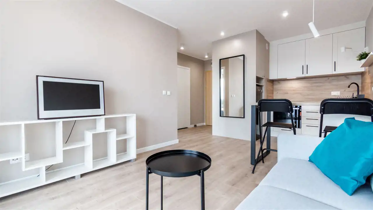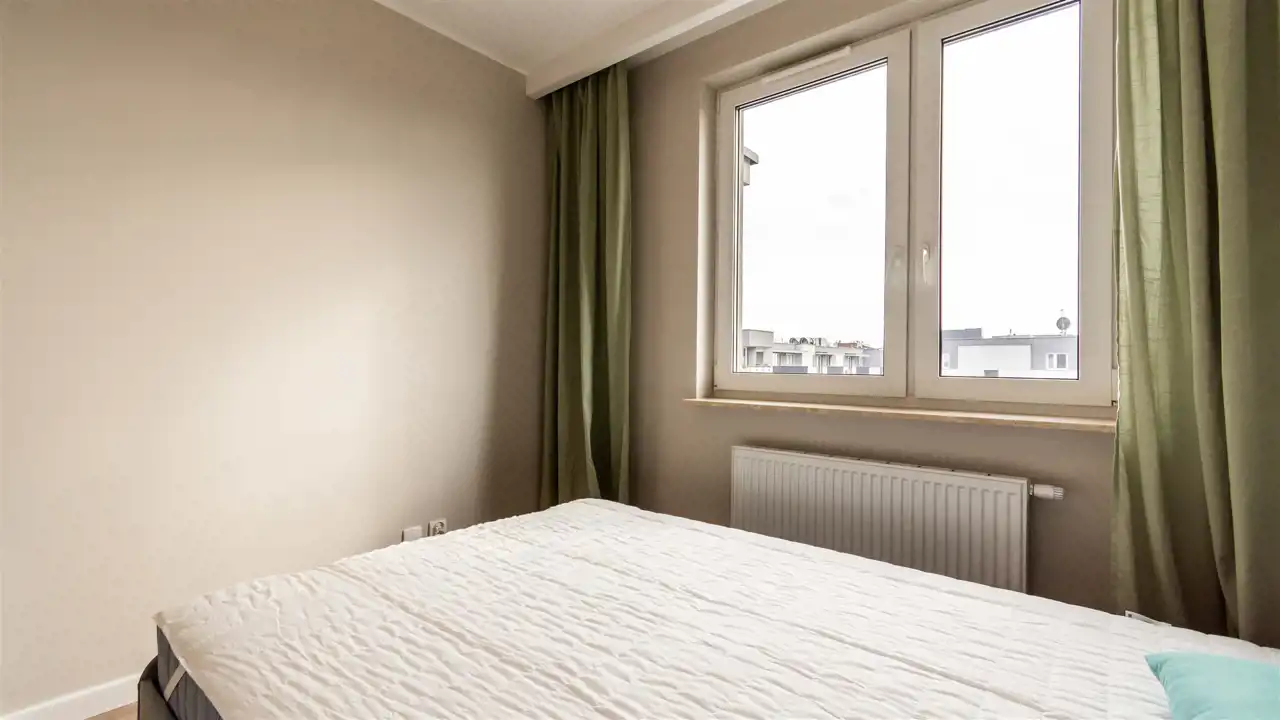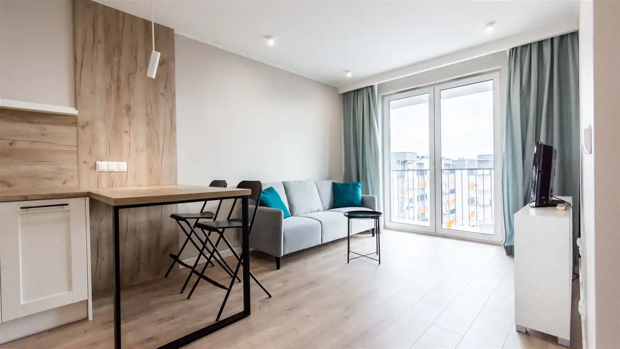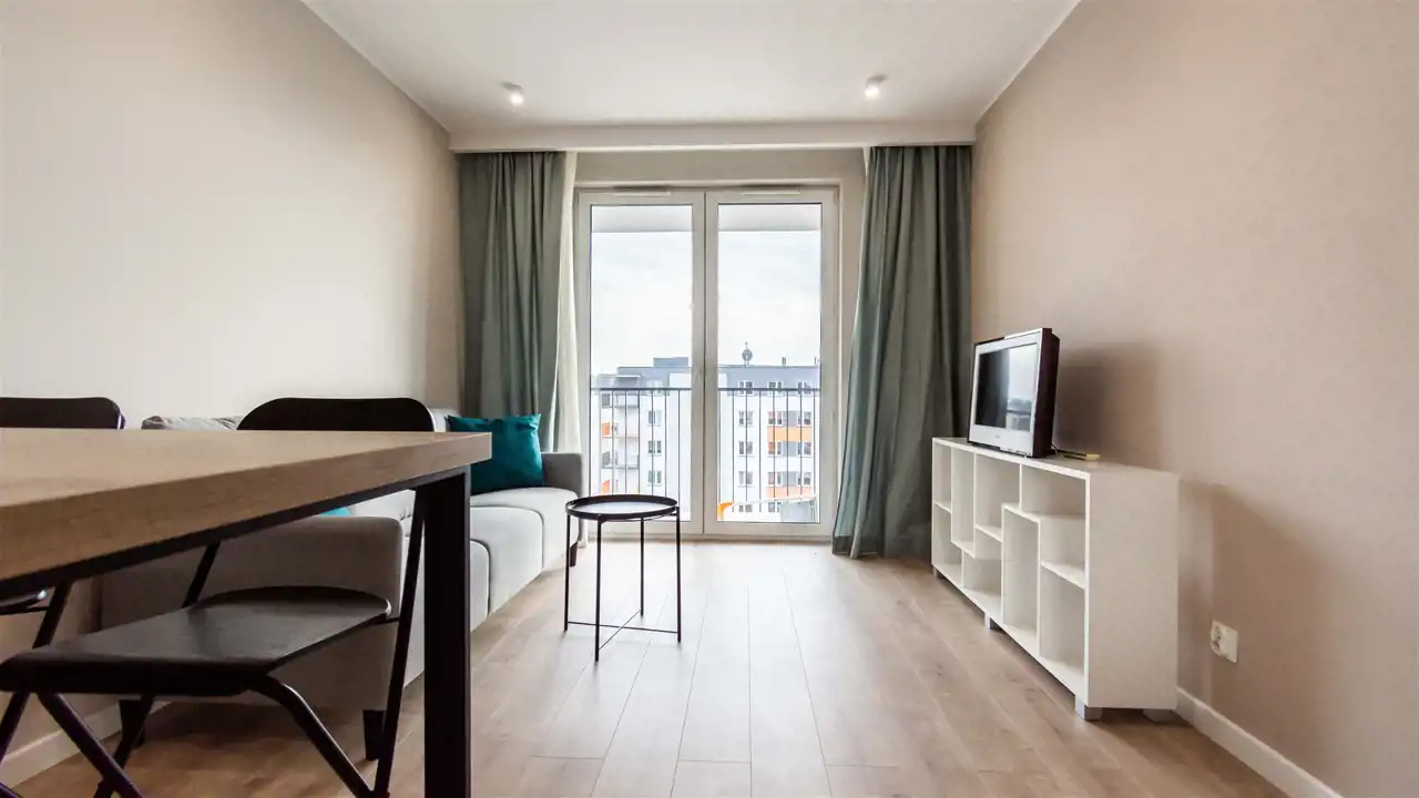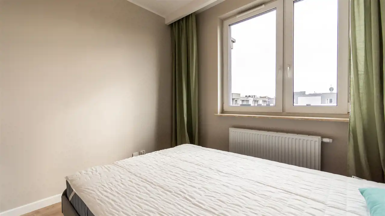 Całość mieszkania zaprojektowana bardzo funkcjonalnie, spokojnie pomieści 1 lub 2 osoby. W przedpokoju pojemna szafa w zabudowie, w kuchni dużo szafek do przechowywania, w sypialni szafa ubraniowa. W kuchni nowe sprzęty AGD: designerska lodówko-zamrażalka, płyta indukcyjna, okap, piekarnik (brak zmywarki). W sypialni łóżko podwójne, w salonie sofa (nierozkładana). Z salonu wyjście na balkon, gdzie w ciepłe wieczory można rozkoszować się winem lub kawą. Ogrzewanie oraz ciepła woda miejskie, brak gazu. Do mieszkania przynależy także komórka lokatorska. Miejsca parkingowe ogólnodostępne za szlabanem dla mieszkańców.