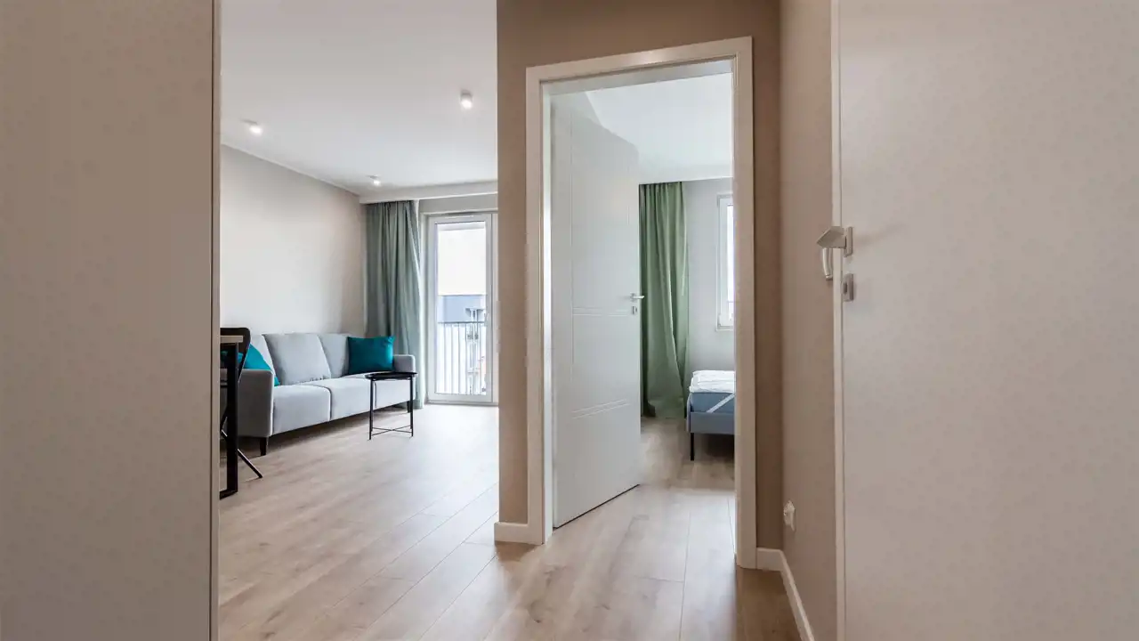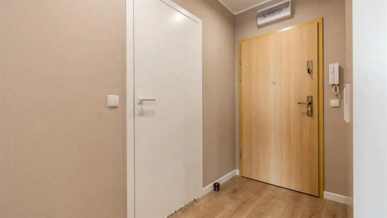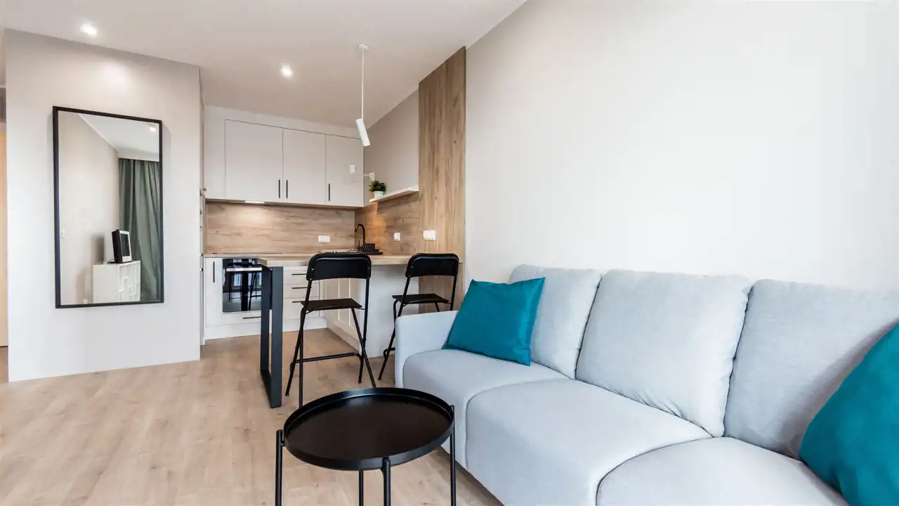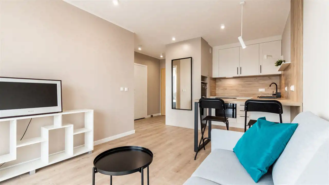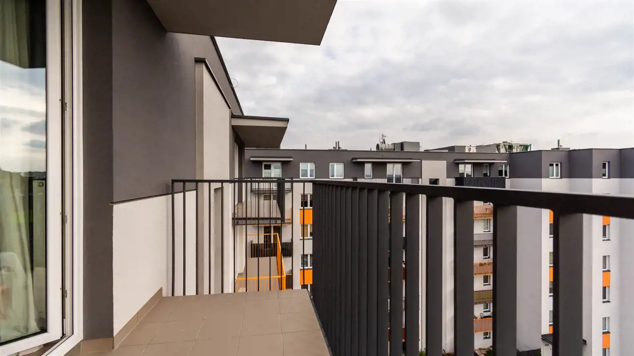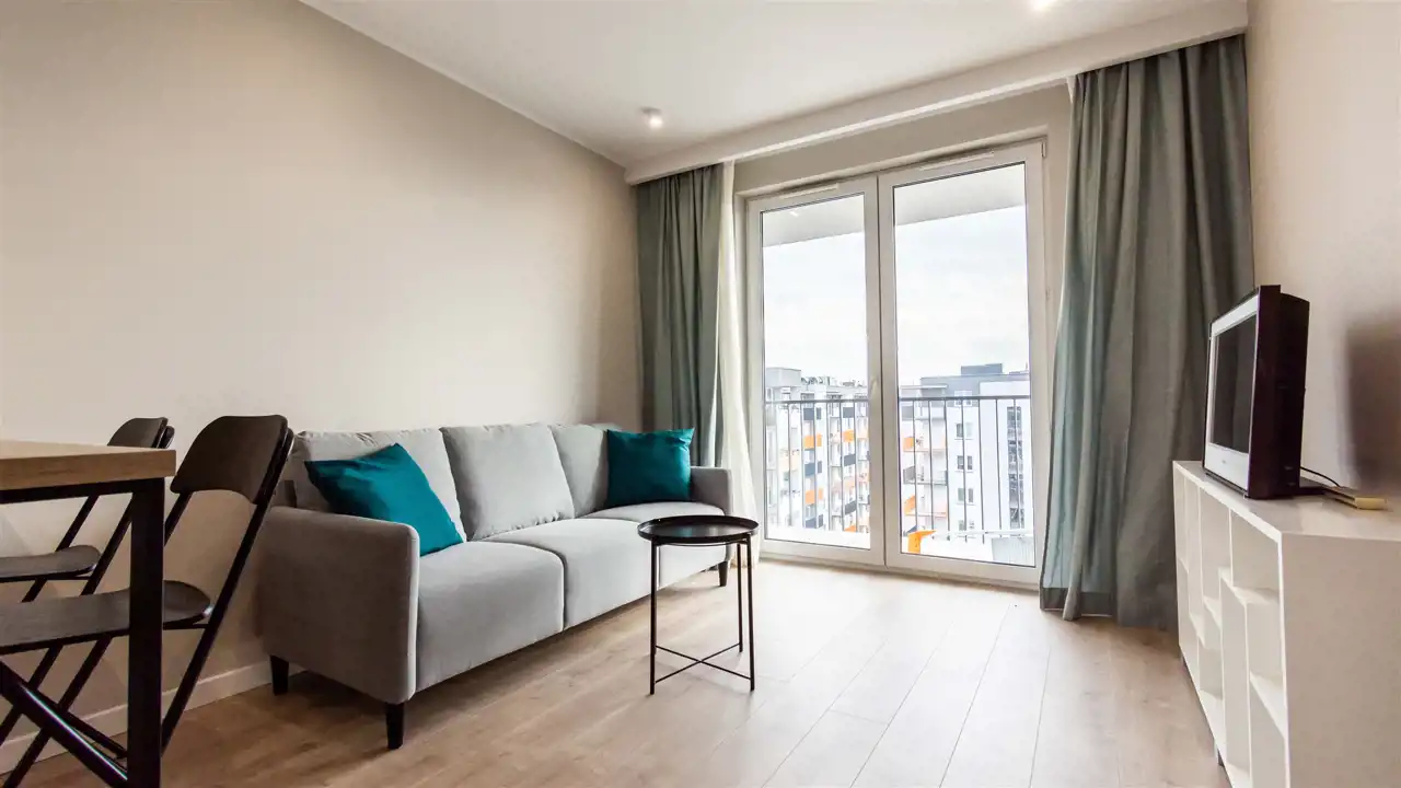 Całość mieszkania zaprojektowana bardzo funkcjonalnie, spokojnie pomieści 1 lub 2 osoby. W przedpokoju pojemna szafa w zabudowie, w kuchni dużo szafek do przechowywania, w sypialni szafa ubraniowa. W kuchni nowe sprzęty AGD: designerska lodówko-zamrażalka, płyta indukcyjna, okap, piekarnik (brak zmywarki). W sypialni łóżko podwójne, w salonie sofa (nierozkładana). Z salonu wyjście na balkon, gdzie w ciepłe wieczory można rozkoszować się winem lub kawą. Ogrzewanie oraz ciepła woda miejskie, brak gazu. Do mieszkania przynależy także komórka lokatorska. Miejsca parkingowe ogólnodostępne za szlabanem dla mieszkańców.
