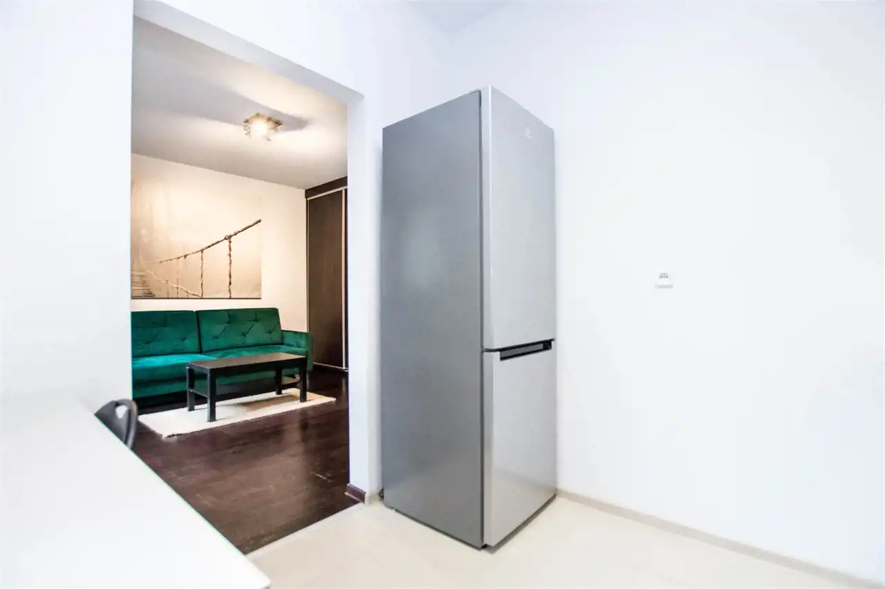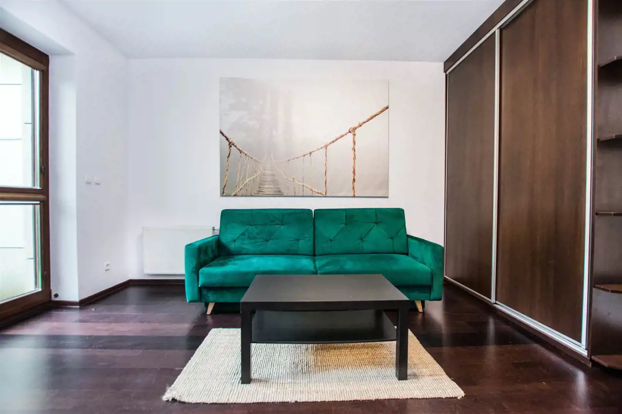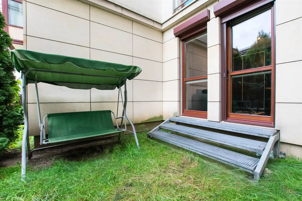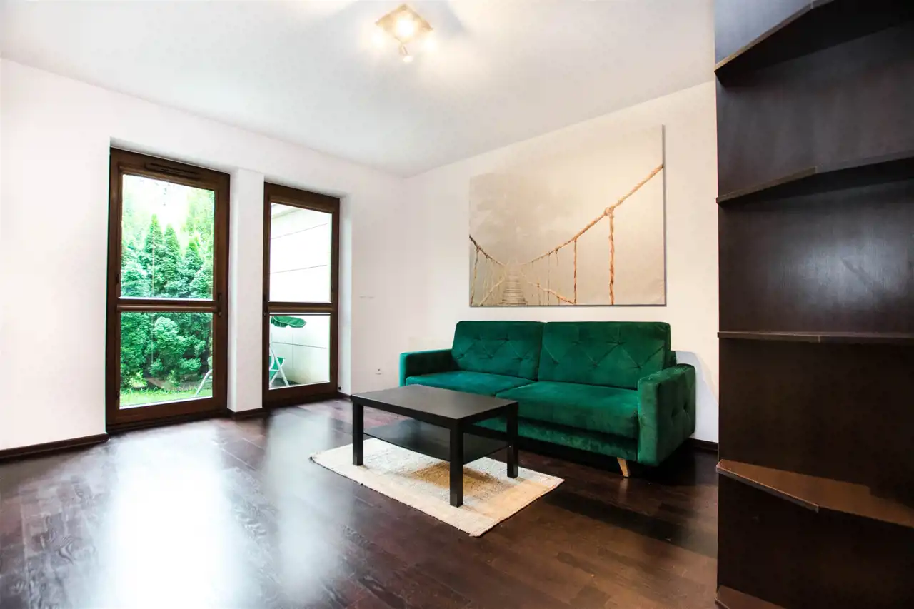 Mieszkanie jest w pełni umeblowane i gotowe do zamieszkania. W salonie znajduje się rozkładana sofa, stolik kawowy, pojemna szafa. Z salonu wyjście na przestronny, gwarantujący prywatność, zielony ogródek. Kuchnia wyposażona jest w płytę indukcyjną, lodówkę, zamrażarkę, miejsce do przechowywania oraz stół z dwoma krzesłami. W łazience znajduje się wanna z parawanem prysznicowym, umywalka z szafką, lustro, pralka oraz toaleta.