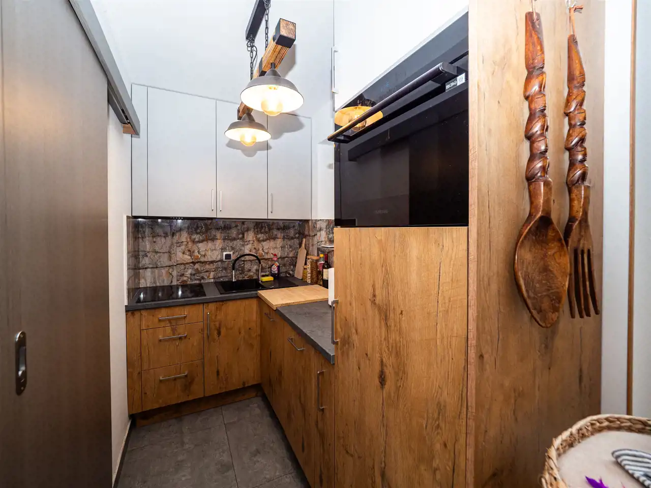 Część kuchenna wyposażona jest w zabudowaną lodówko-zamrażarkę, zmywarkę, piekarnik z funkcją mikrofali, płytę indukcyjną, ukrytą pralkę, stół z dwoma ręcznie ozdabianymi krzesłami oraz liczne szafki.