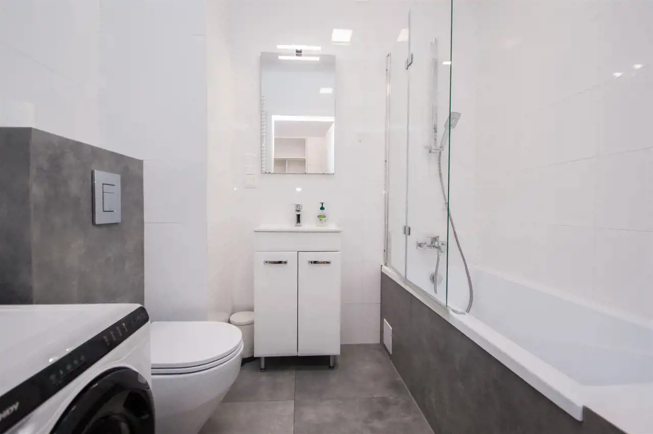 Gustownie urządzona łazienka z wanną oraz opcją prysznica, toaletą, umywalką oraz szafkę w zabudowie, lustro i pralkę.