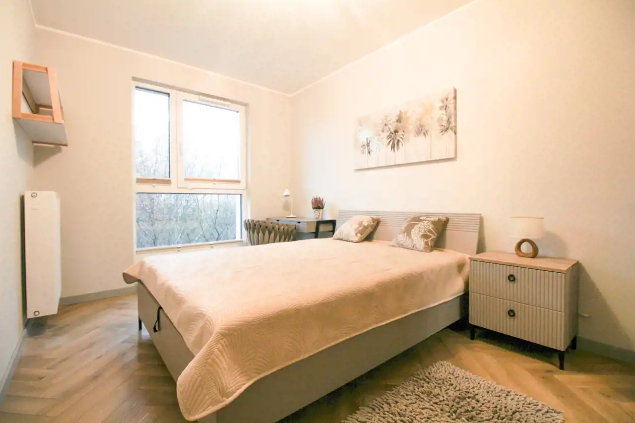 Wyposażenie kuchni to m.in. ZMYWARKA, piekarnik z funkcją mikrofalówki, płyta grzewcza, lodówkę, stół z krzesłami. W salonie kanapa, stolik kawowy. W sypialni znajduje się podwójne łóżko z materacem, duża szafa, biurko mogące robić za toaletkę oraz szafka nocna. W łazience - pralka, prysznic, WC, umywalka, lustro, szafki w zabudowie, grzejnik drabinkowy. W przedpokoju duża szafa. Kontrola dostępu: domofon.