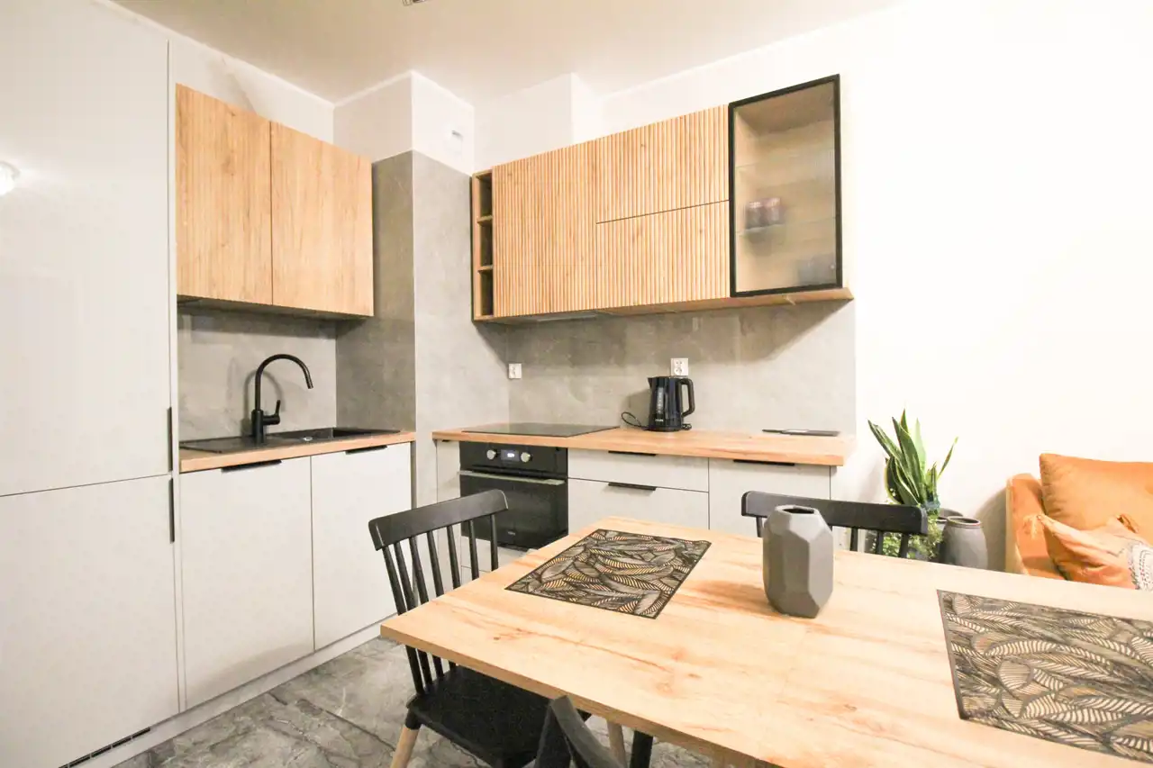 EQUIPMENT: The apartment is ready to move in. It has been equipped with high-end energy household appliances and electronics. Kitchen equipment includes a dishwasher, oven with microwave function, hob, refrigerator, table and chairs. In the living room sofa, coffee table. In the bedroom there is a double bed with a mattress, a large closet, a desk and night stand. In the bathroom - washing machine, shower, toilet, sink, mirror, built-in cabinets, ladder radiator. In the hallway - a large closet. Access control: intercom.