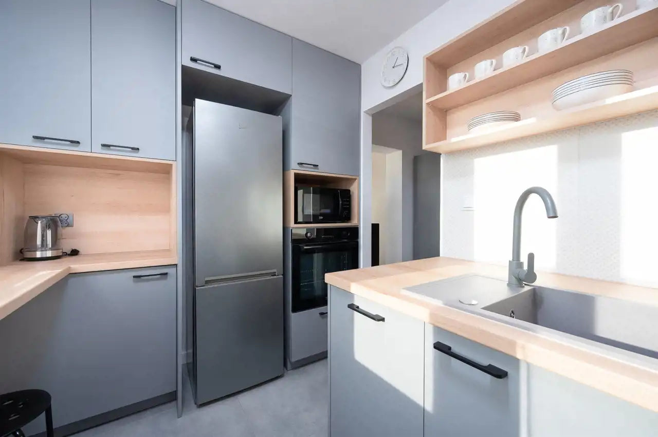W kuchni: zabudowa kuchenna na wymiar, sprzęt AGD (płyta, piekarnik, okap, lodówko-zamrażarka, zmywarka, mikrofalówka)