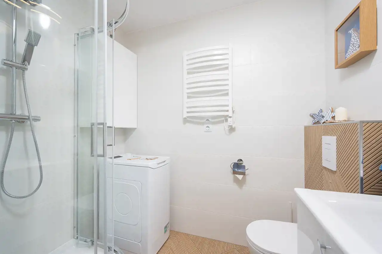 W łazience: kabina prysznicowa, wc, umywalka, pralka, szafka