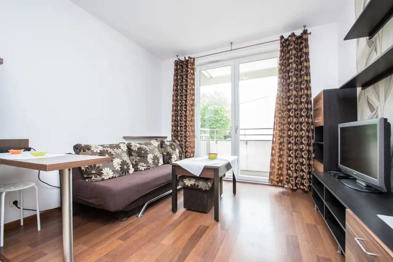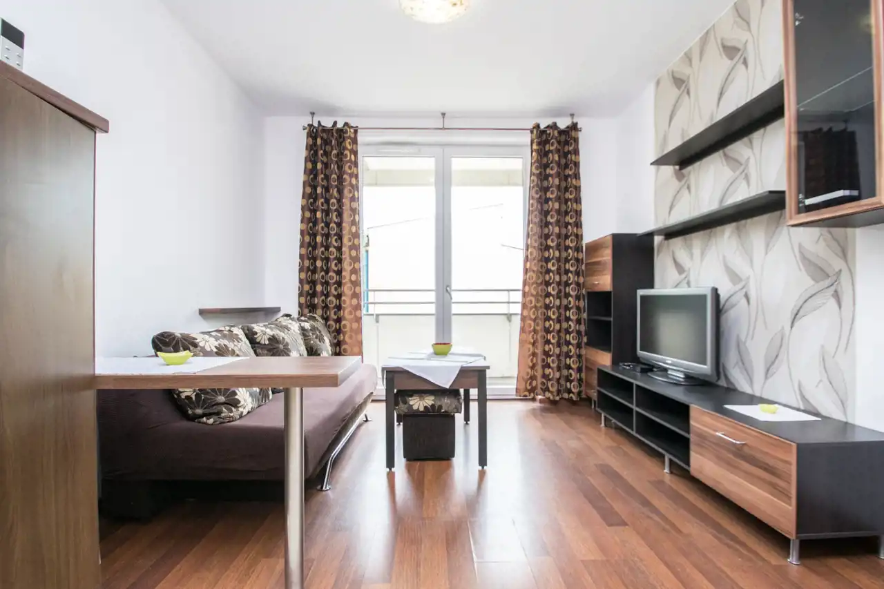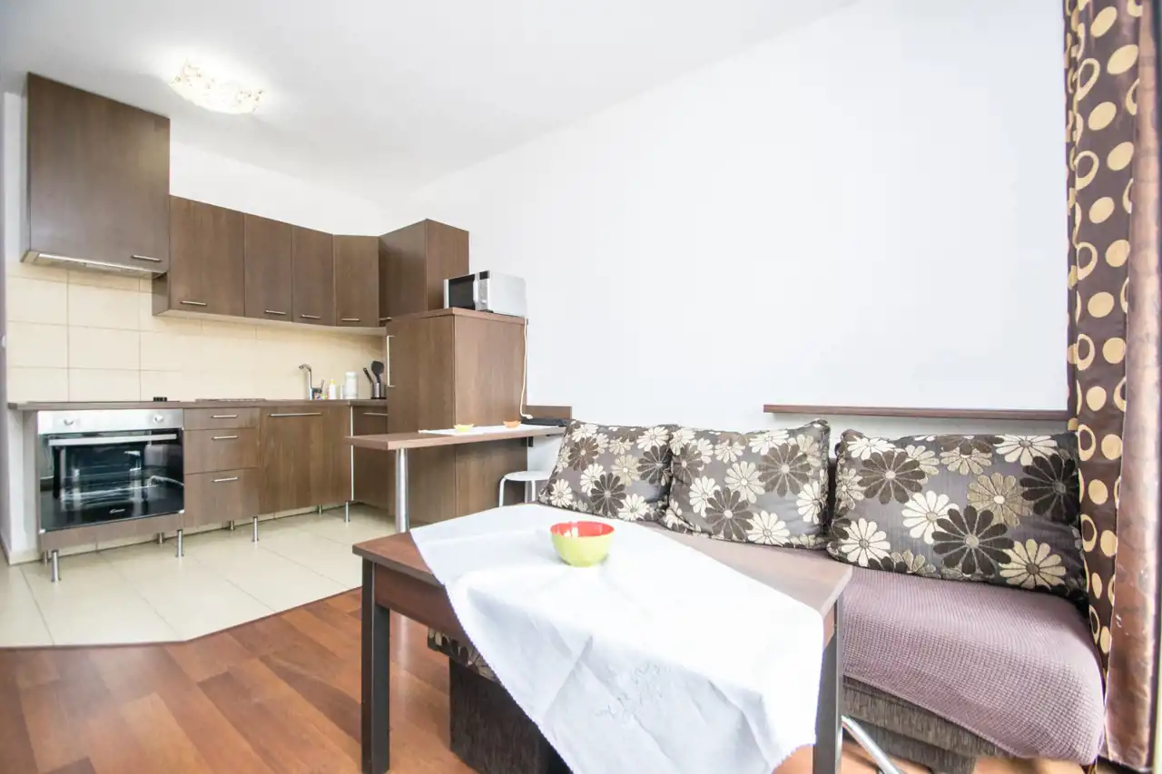 Mieszkania jest w pełni umeblowane i wyposażone. W kuchni wszystkie potrzebne sprzęty AGD (lodówko-zamrażalka, mikrofalówka, płyta grzewcza,) oraz stół. Dodatkowo w szafkach znajduje się pełne wyposażenie kuchenne, sztućce, szklanki talerze, garnki, itp. Salon wyposażony w sofę, stolik kawowy, meble do przechowywania oraz TV. W sypialni podwójne wygodne łóżko, szafa. Łazienka z wanną z opcją prysznicu, pralką, umywalką. W przedpokoju szafa oraz komoda. Mieszkanie bardzo przytulne i komfortowe w pełni wyposażone. W budynku nie ma gazu.