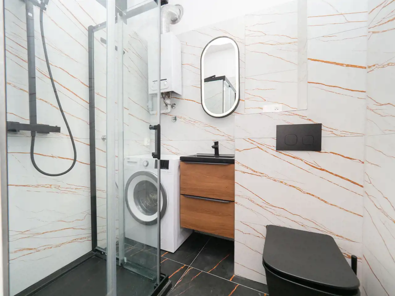 - osobna kuchnia z meblami w zabudowie oraz sprzętem AGD: lodówka, zmywarka, płyta indukcyjna, piekarnik, okap, czajnik,