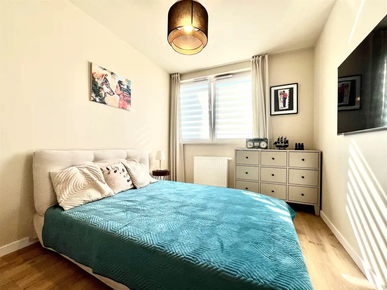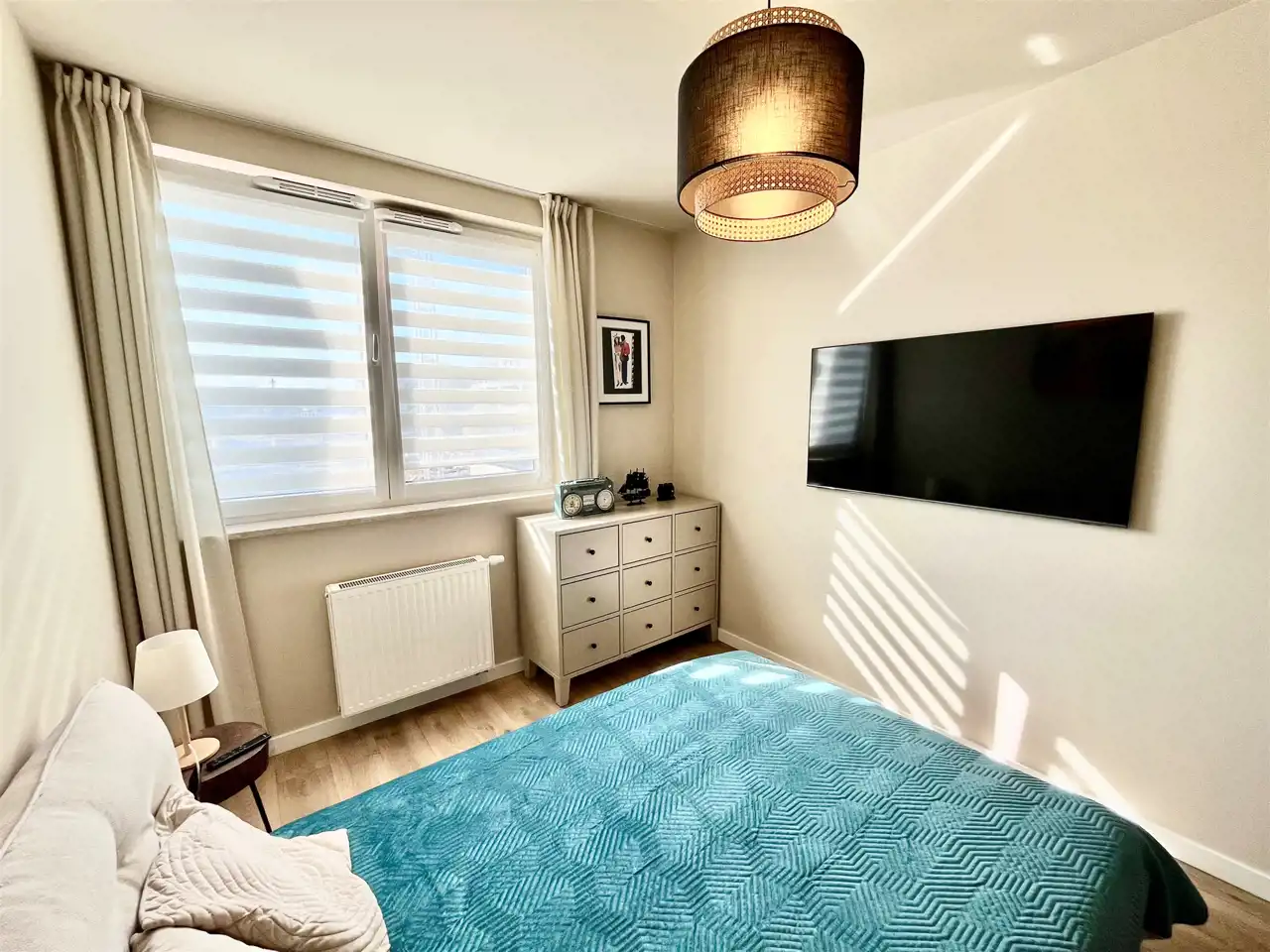w sypialni: łóżko 140 x 200 cm, duża szafa, komoda i drugi telewizor