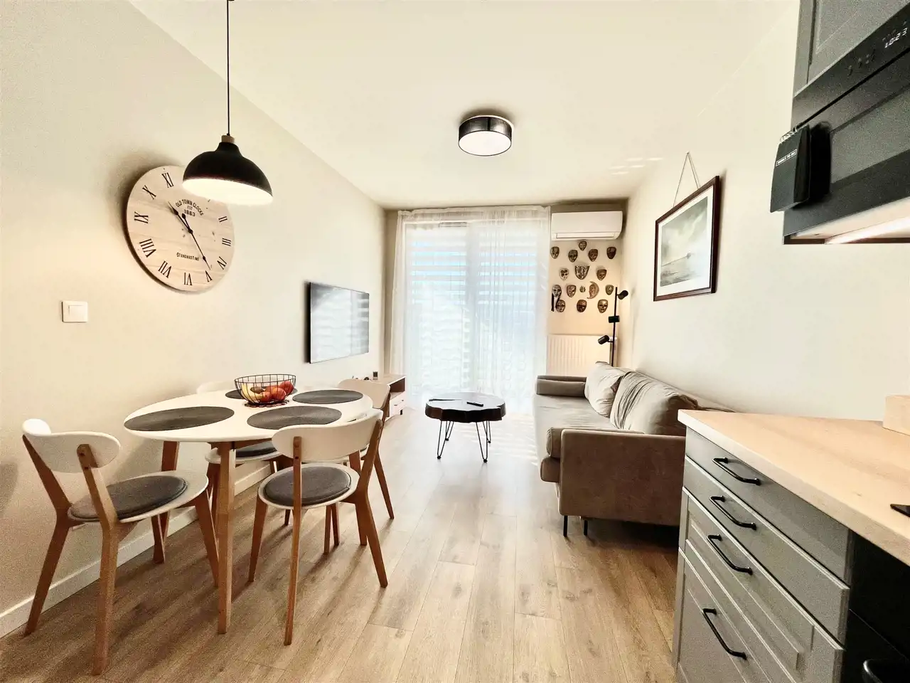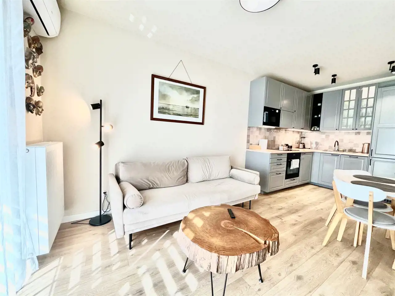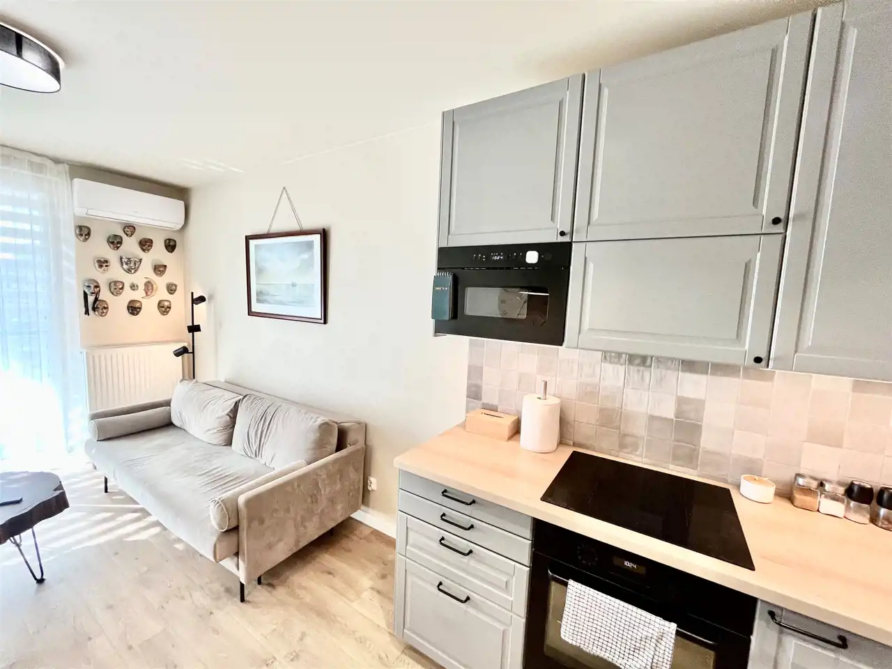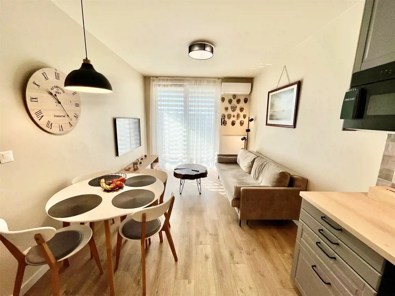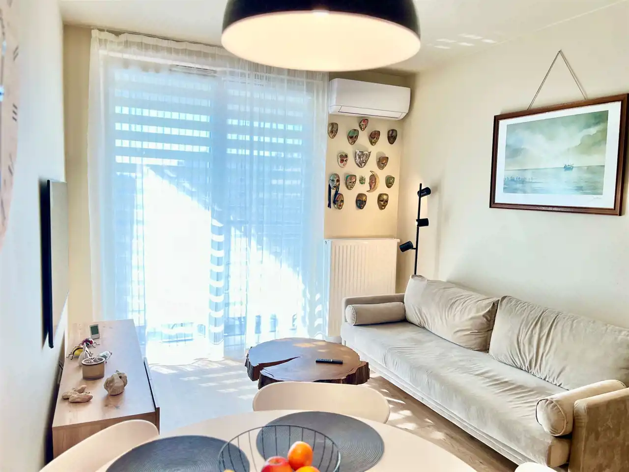 w części wypoczynkowej: rozkładana sofa, klimatyzacja, telewizor