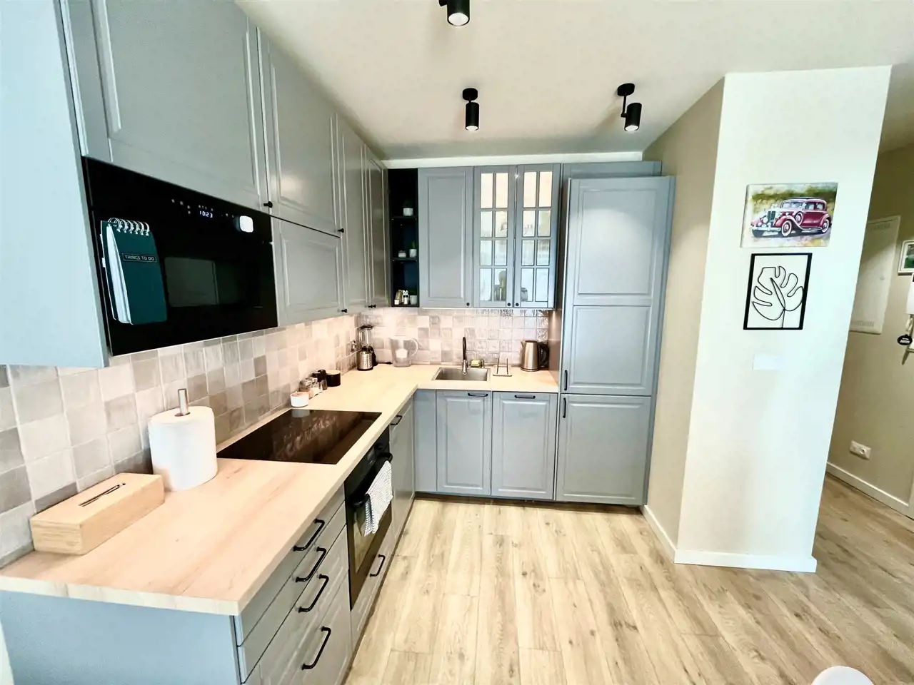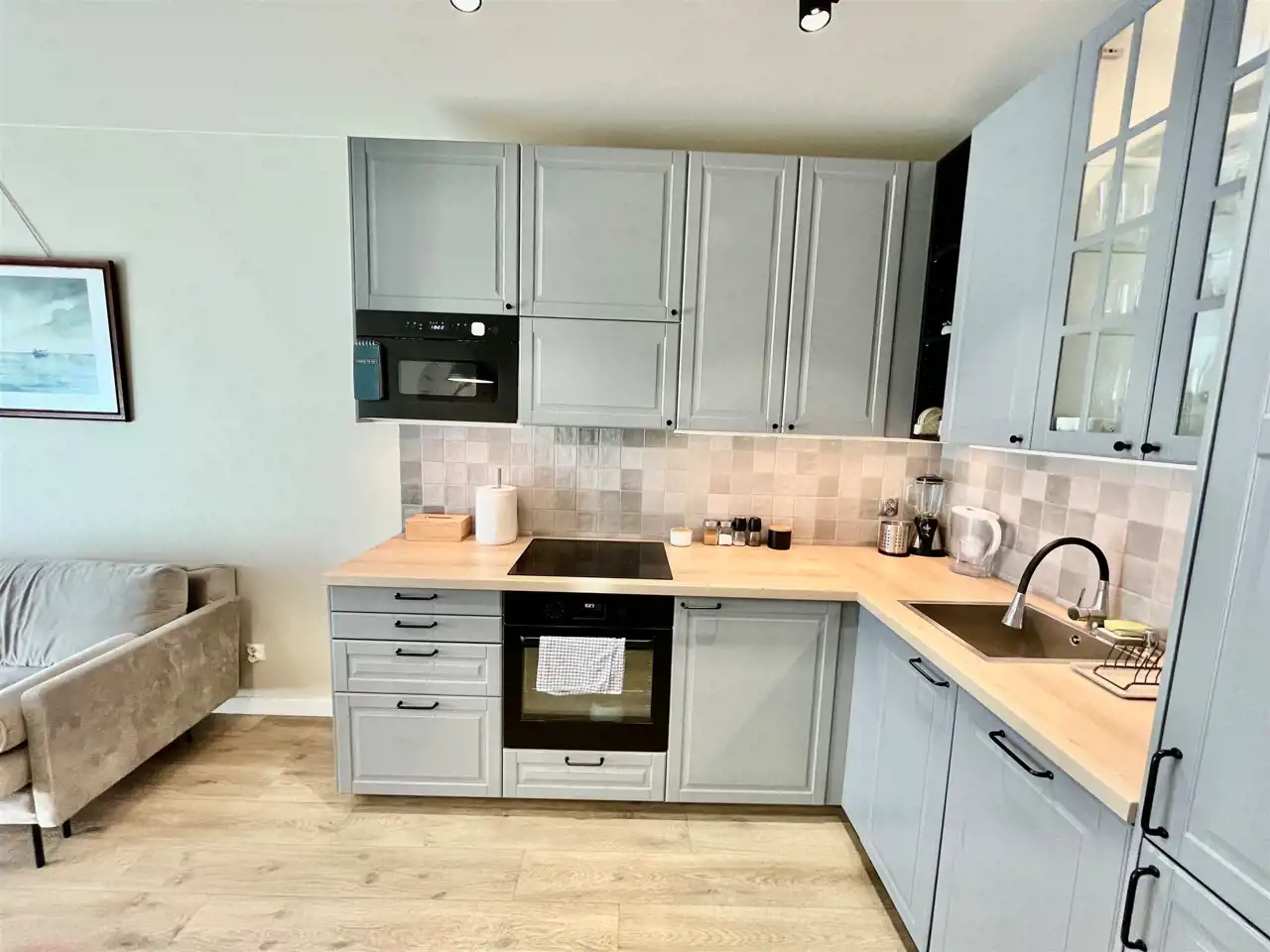 w części kuchennej: zmywarka, okap, chłodziarko-zamrażarka, płyta indukcyjna, mikrofala, piekarnik