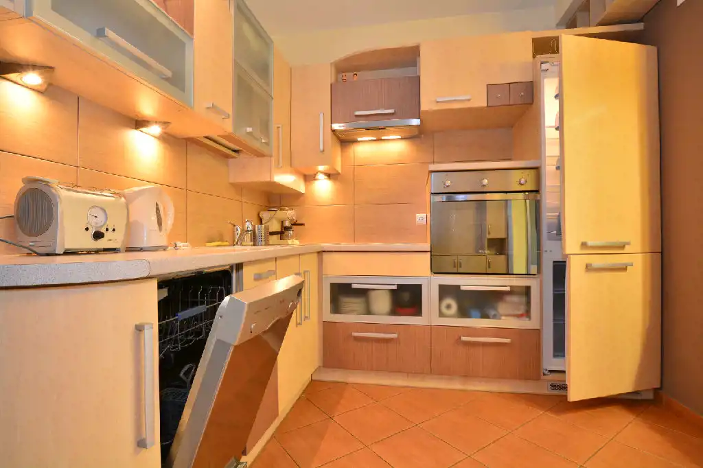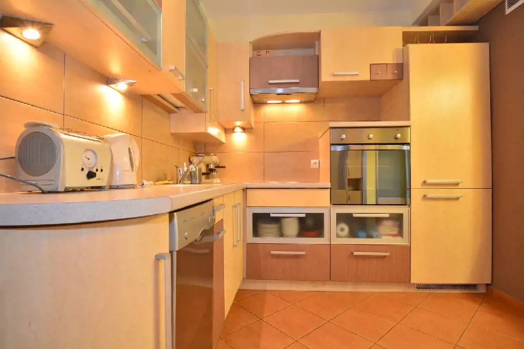 - kuchni (6m2) wyposażonej w zabudowę oraz sprzęt AGD tj. lodówko-zamrażarka, płyta grzewcza, okap, piekarnik, zmywarka, mikrofala, czajnik a także wszelkie urządzenia i przyrządy kuchenne,