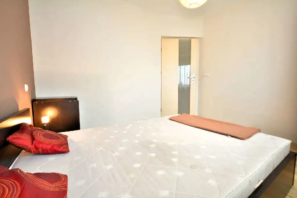 - sypialni (10m2) wyposażonej w łóżko stelażowe wraz z nowym materacem, dwóch małych szafek nocnych , komody oraz regału