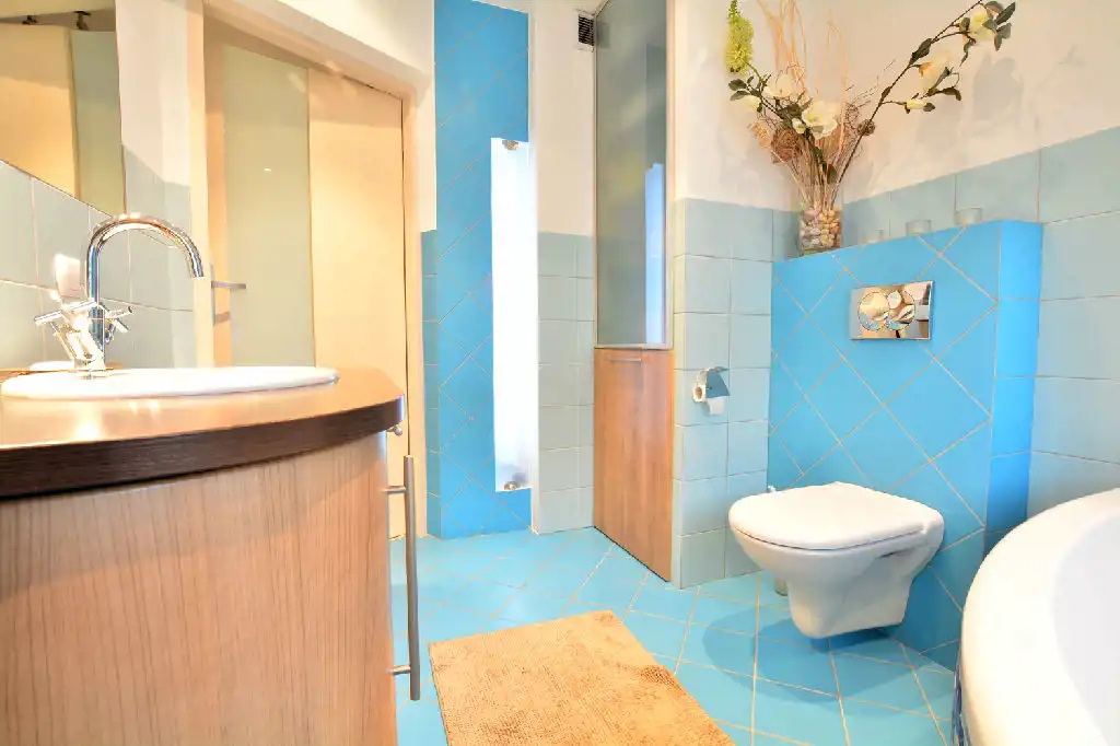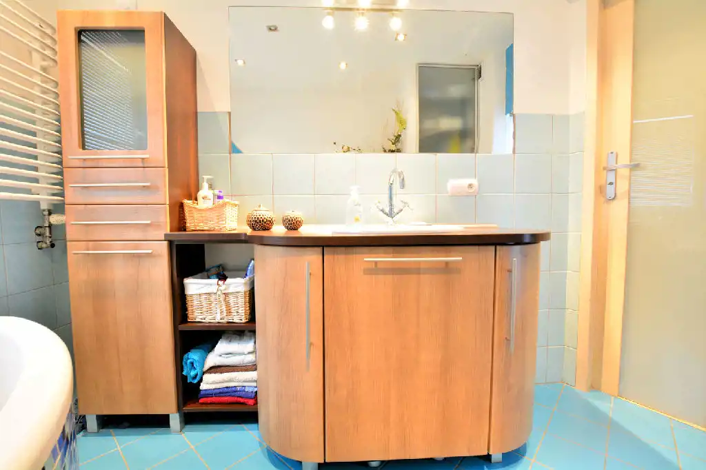 - łazienki wraz z wc (5m2) wyposażoną w pralkę, ogrzewanie podłogowe, regał zamykany, komodę oraz półki pod umywalką,