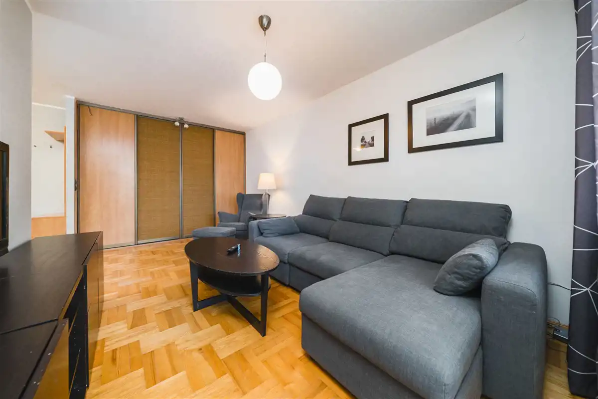 - salon o powierzchni 19 m2, przestronny, otwarty z wyjściem na loggie (balkon z osobnym wejściem z salonu i z kuchni). Szafa w zabudowie na całej ścianie + meble salonowe pod TV, sofa z funkcją spania, fotel i podnóżek.