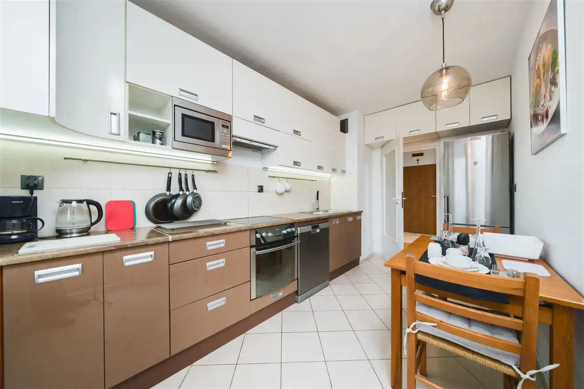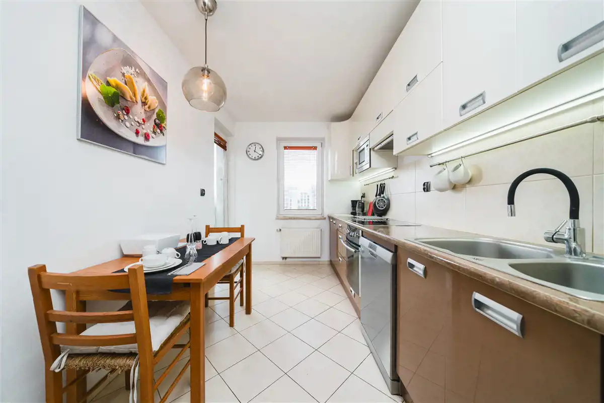 - kuchnia o powierzchni 11 m2, widna z oknem i wyjściem na balkon. Zabudowa pod wymiar. Pełne wyposażenie: lodówka, zmywarka, okap i mikrofala (Siemens), kuchenka elektryczna z piekarnikiem (Amica).