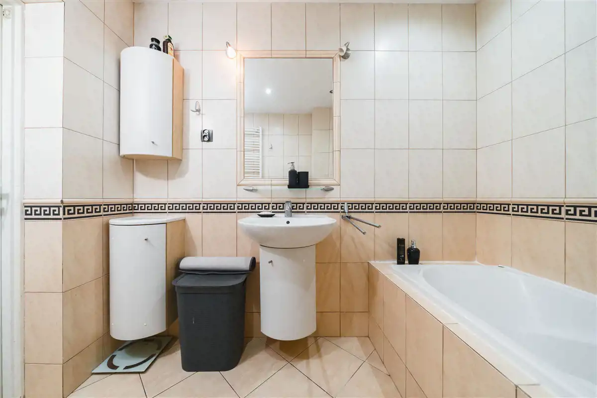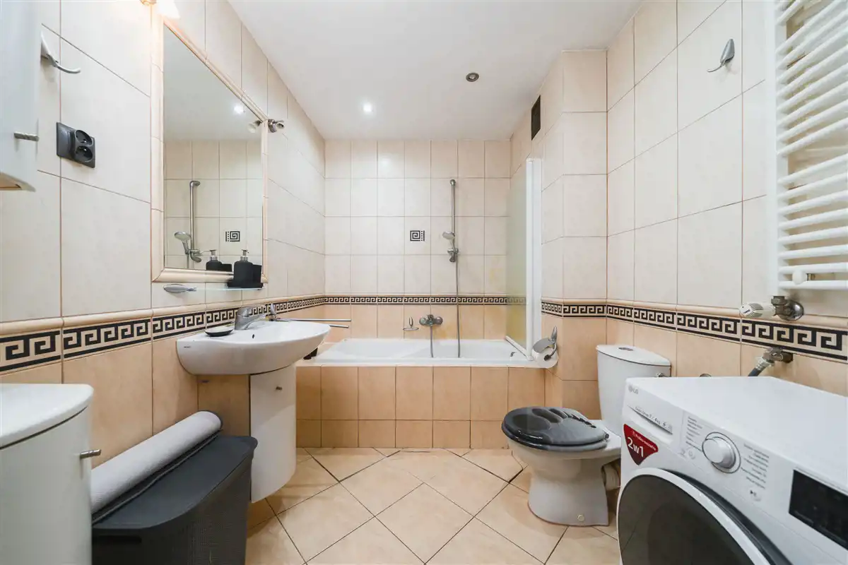 - łazienka na planie kwadratu (ustawna), pralka (Siemens), wanna połączona z prysznicem.