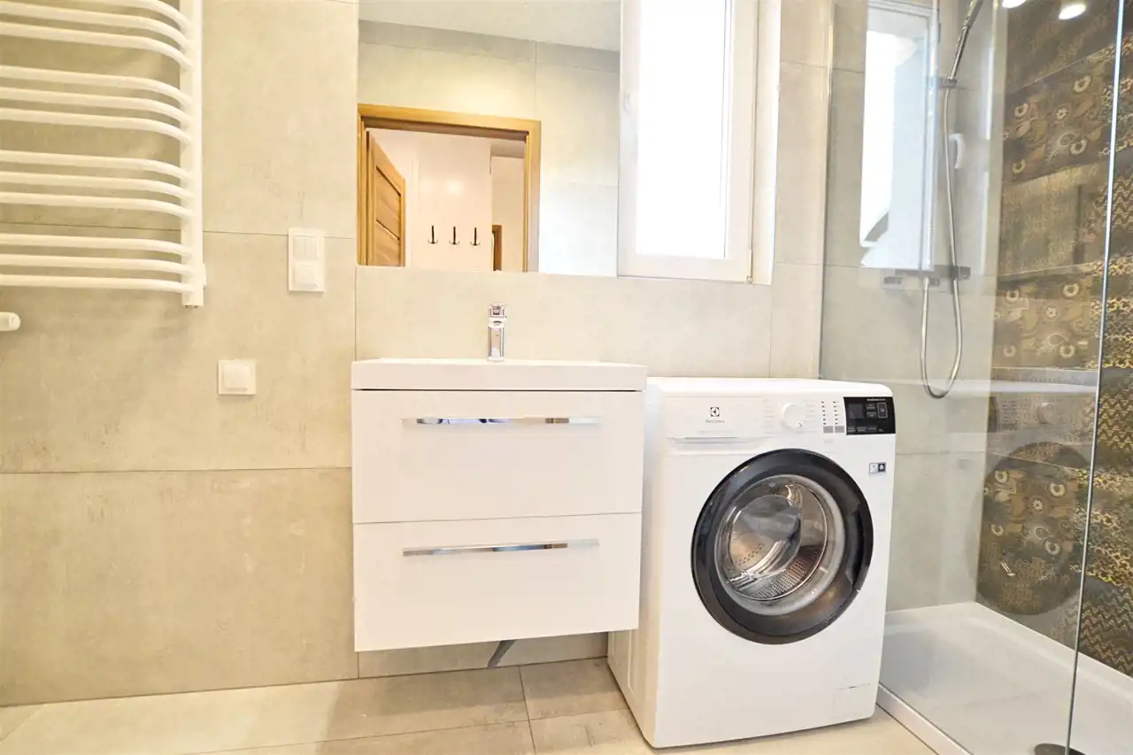 Z salonu wyjście na spory balkon. Mieszkanie umeblowane i wyposażone w sprzęt AGD ( pralko- suszarka, zmywarka, płyta, piekarnik). Na wyposażeniu w sypialni wygodne, podwójne łóżko oraz toaletka, w salonie rozkładana kanapa. W przedpokoju wbudowane pojemne szafy. W mieszkaniu założona klimatyzacja. Miejsca parkingowe dostępne przy budynku.