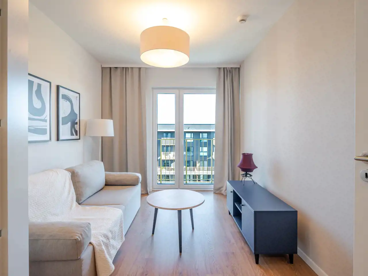 Pokój dzienny: rozkładana sofa, stolik kawowy, szafa, szafka RTV.