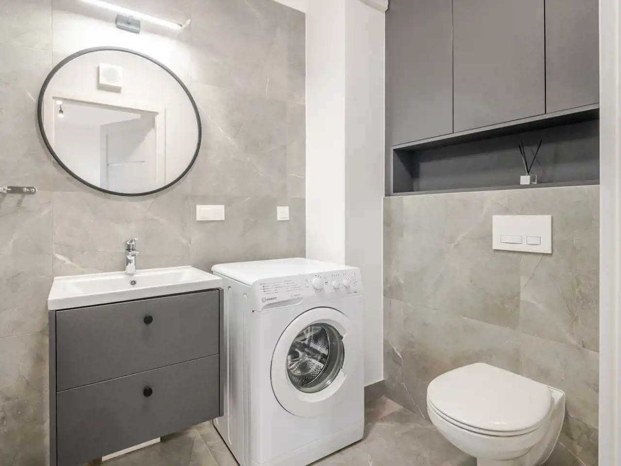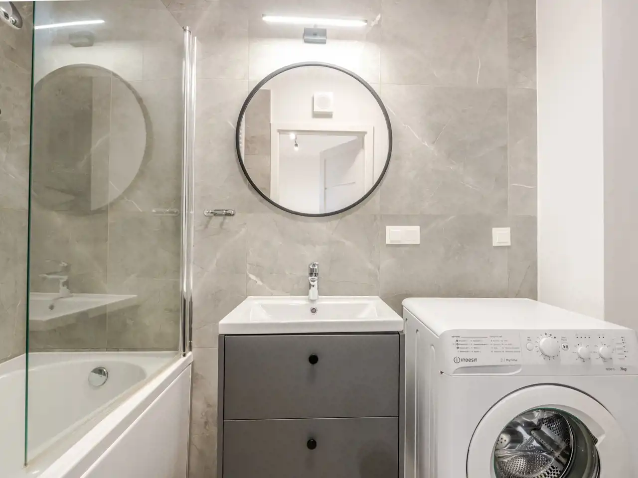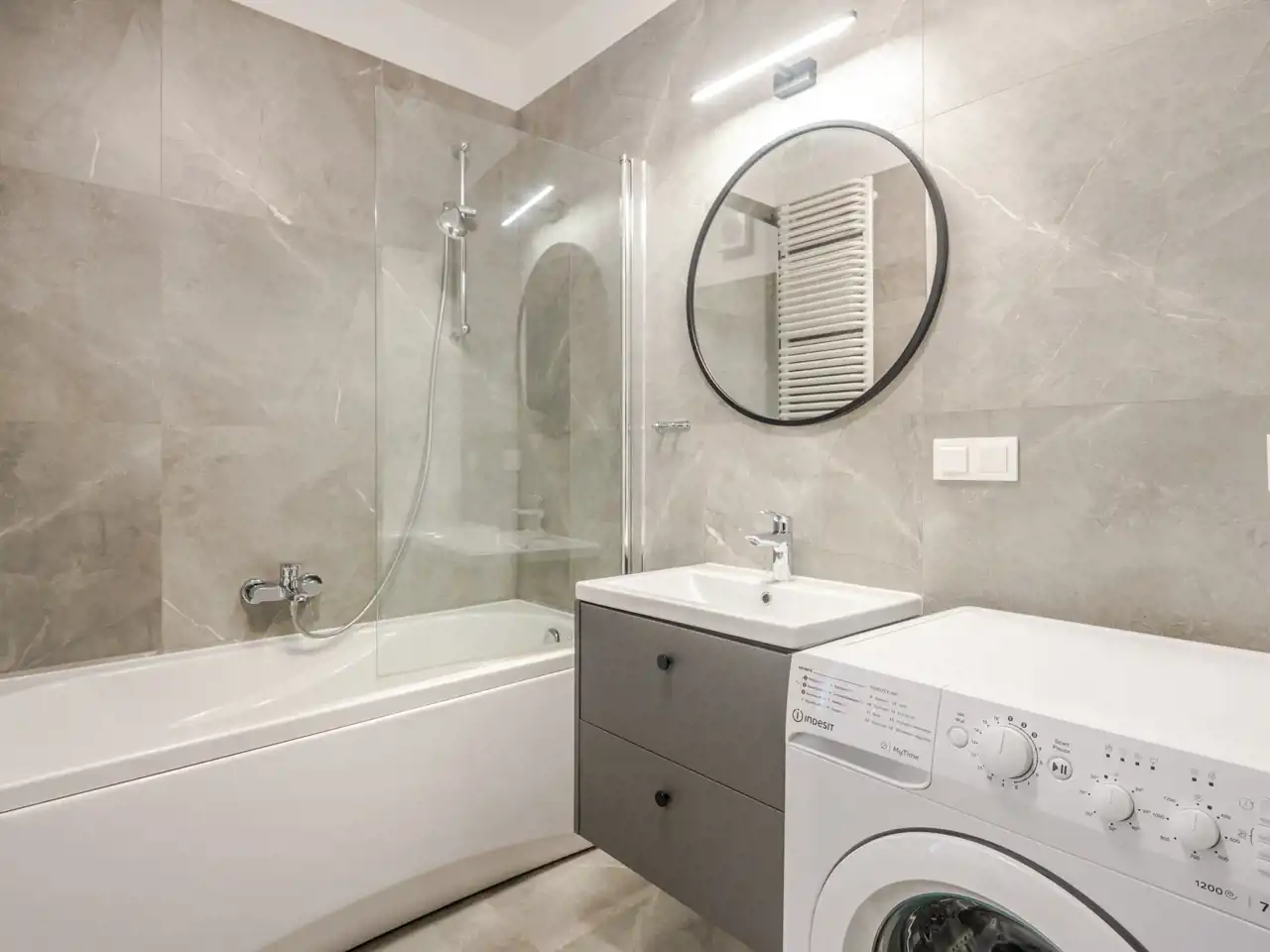 Łazienka: prysznic, pralka, szafka pod umywalką oraz szafka wisząca.