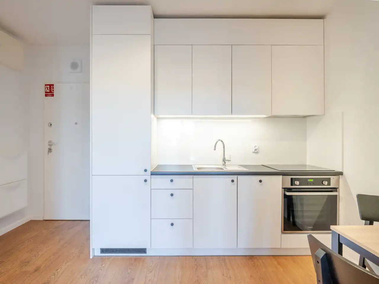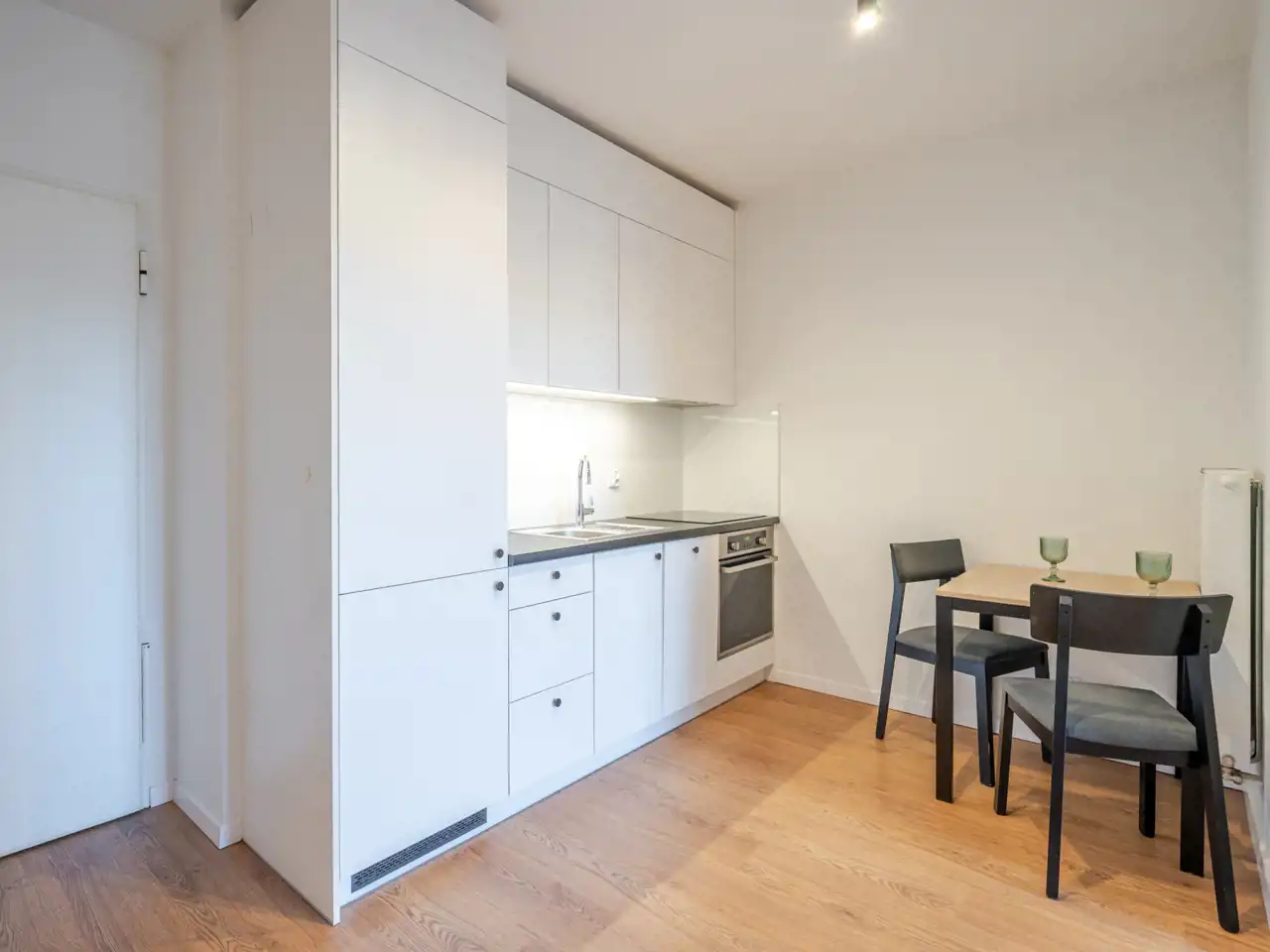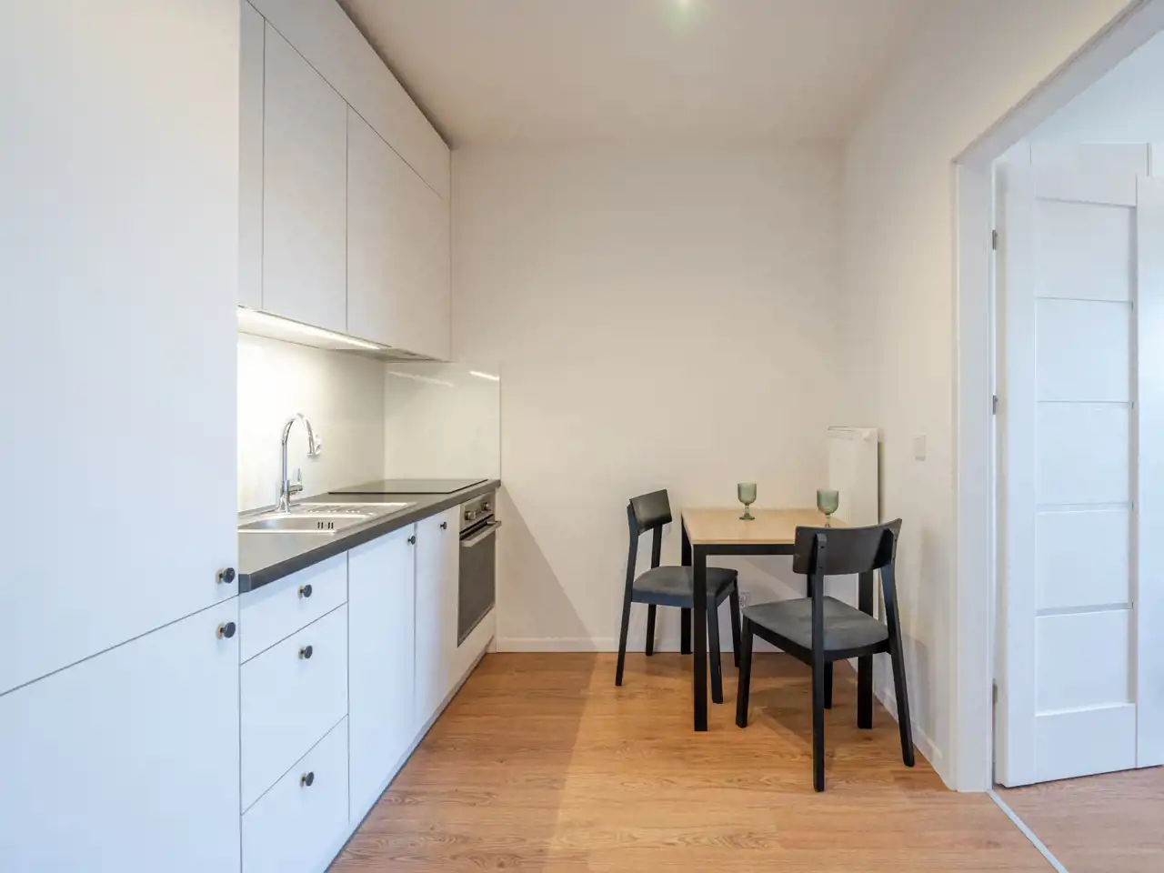 Aneks kuchenny: płyta grzewcza, lodówko-zamrażarka, okap, zmywarka, stół z dwoma krzesłami.