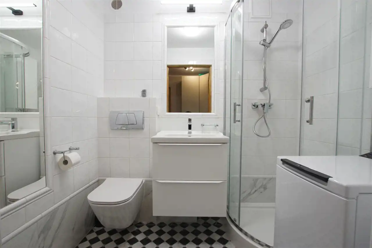 w łazience kabina prysznicowa, umywalka, wc, pralka