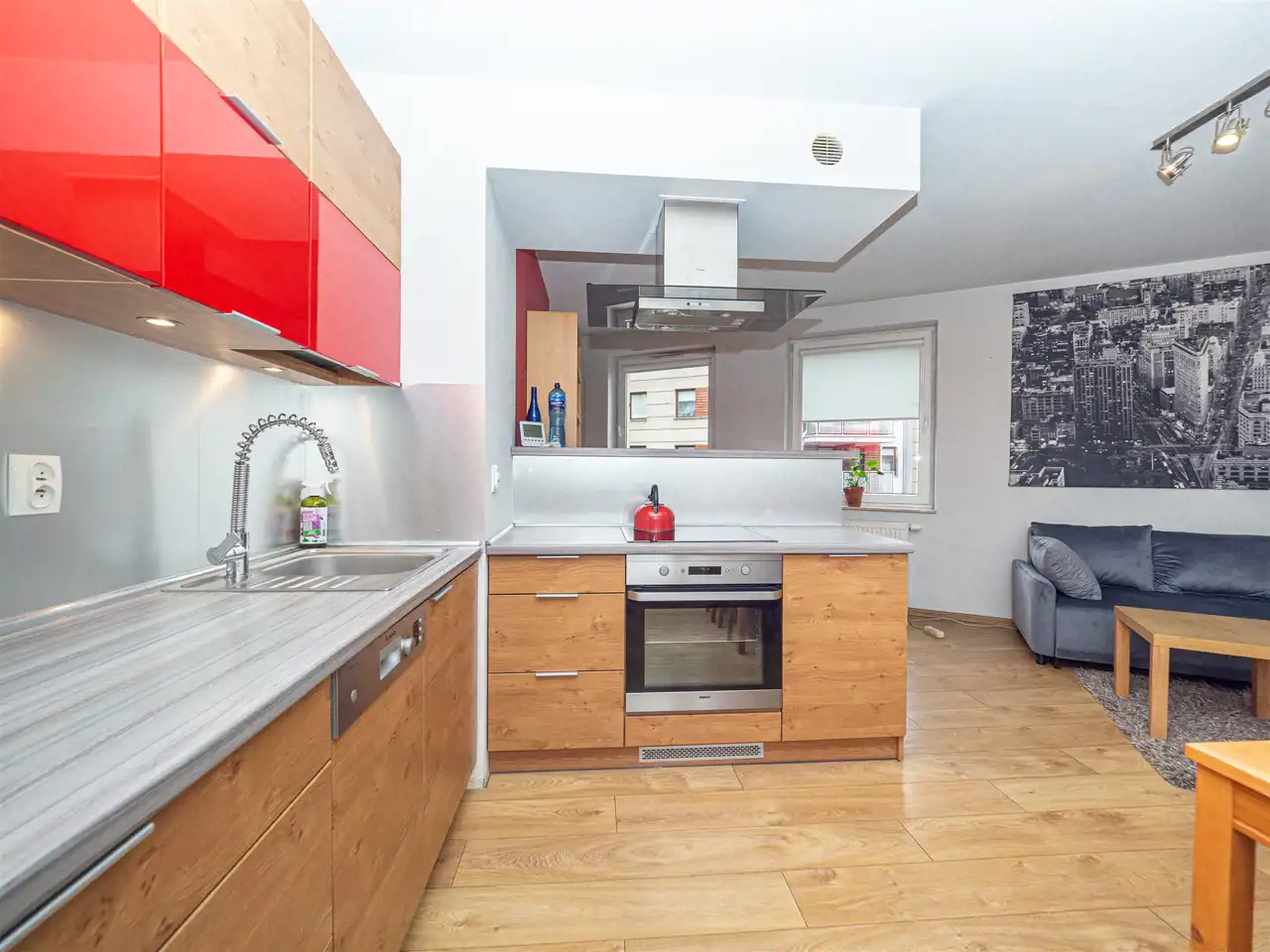 - Salon z aneksem kuchennym gdzie znajduje się sofa, stolik kawowy, stół z krzesłami, stół barowy z krzesłami barowymi oraz starannie wykończona kuchnia z meblami w zabudowie, oraz pełnym sprzętem AGD z wykończeniem. W kuchni znajduje się lodówko/zamrażarka, zmywarka, piekarnik, płyta indukcyjna oraz wyposażenie drobne tj. sztućce, naczynia.