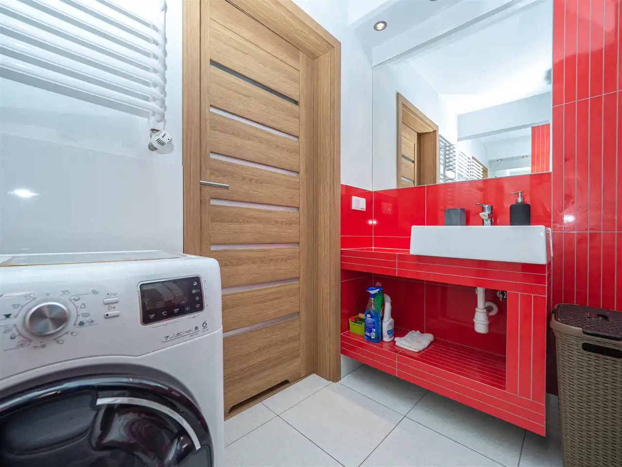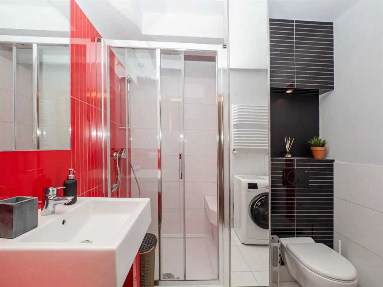 - Łazienka z dużą kabiną prysznicową, pralką, umywalką oraz szafkami.