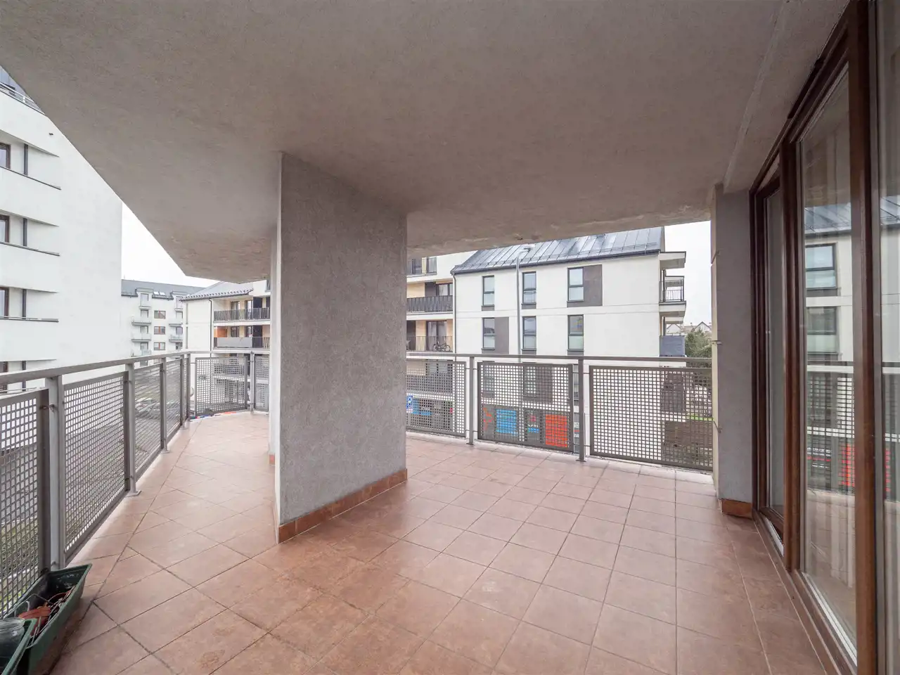 Z salonu znajduje się wyjście na duży balkon, gdzie widok rozpościera się na osiedle.