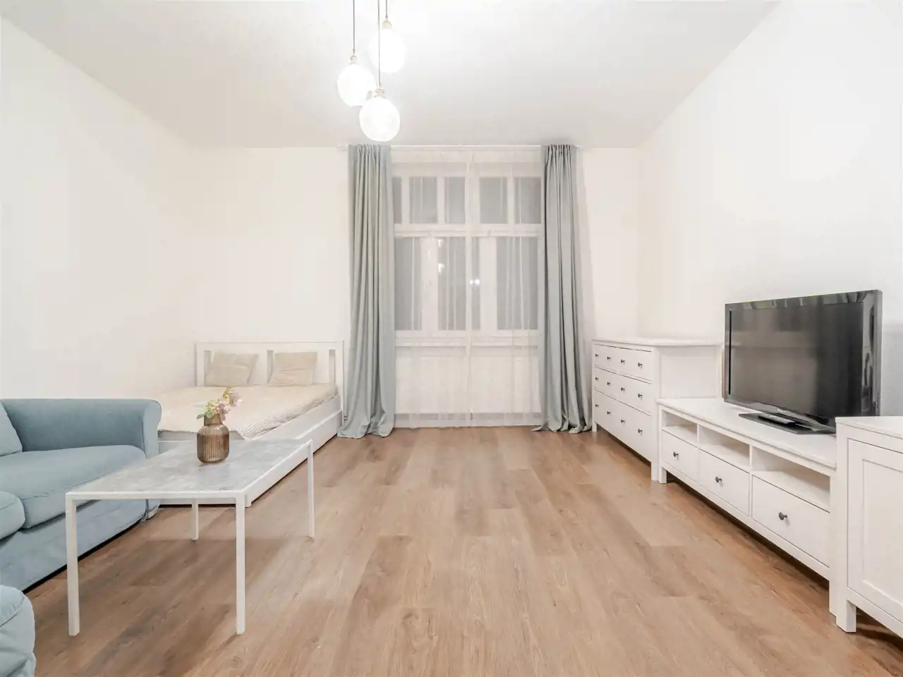 Pokój wyposażony w łóżko, kanapę, tv, komodę, szafkę RTV, biurko.