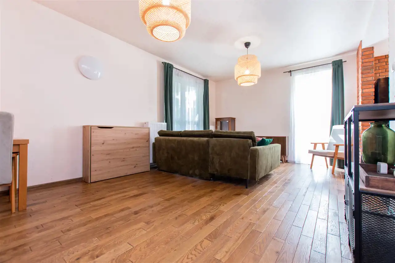 - salon z rozkładanym łóżkiem dwuosobowym, miejscem do pracy i wyjściem na dwa ogródki,