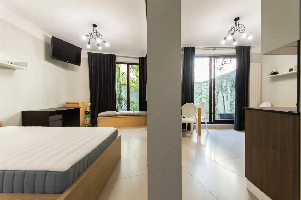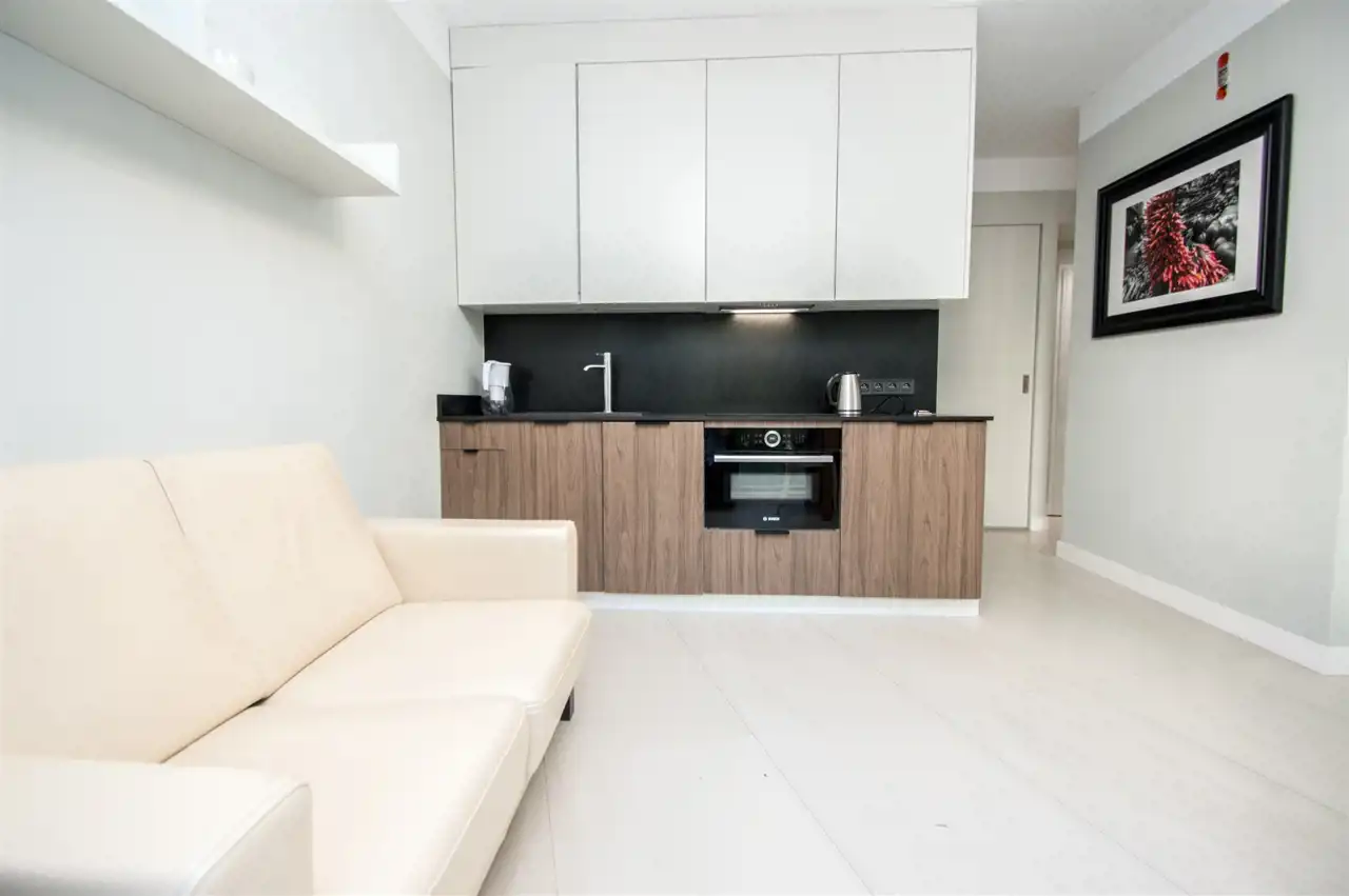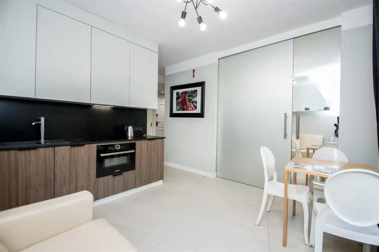 W pełni umeblowany i wyposażony w wysokiej klasy sprzęt i meble apartament. Nowoczesny salon z sofą, stołem z krzesłami, połączony z aneksem kuchennym i częścią jadalnianą. Kuchnia wyposażona w sprzęt AGD tj. płyta indukcyjna, piekarnik, lodówka z zamrażalnikiem, oraz wyposażenie drobne jak sztućce, garnki itp. W sypialni podwójne łóżko, sofę, TV,. W łazience kabina prysznicowa, pralka, umywalka i toaleta. Mieszkanie w pełni umeblowane wyposażone i gotowe do zamieszkania.