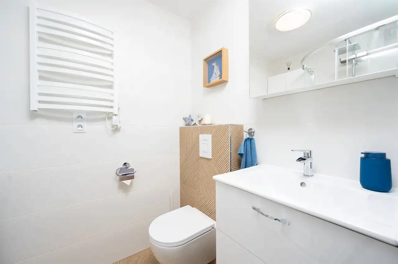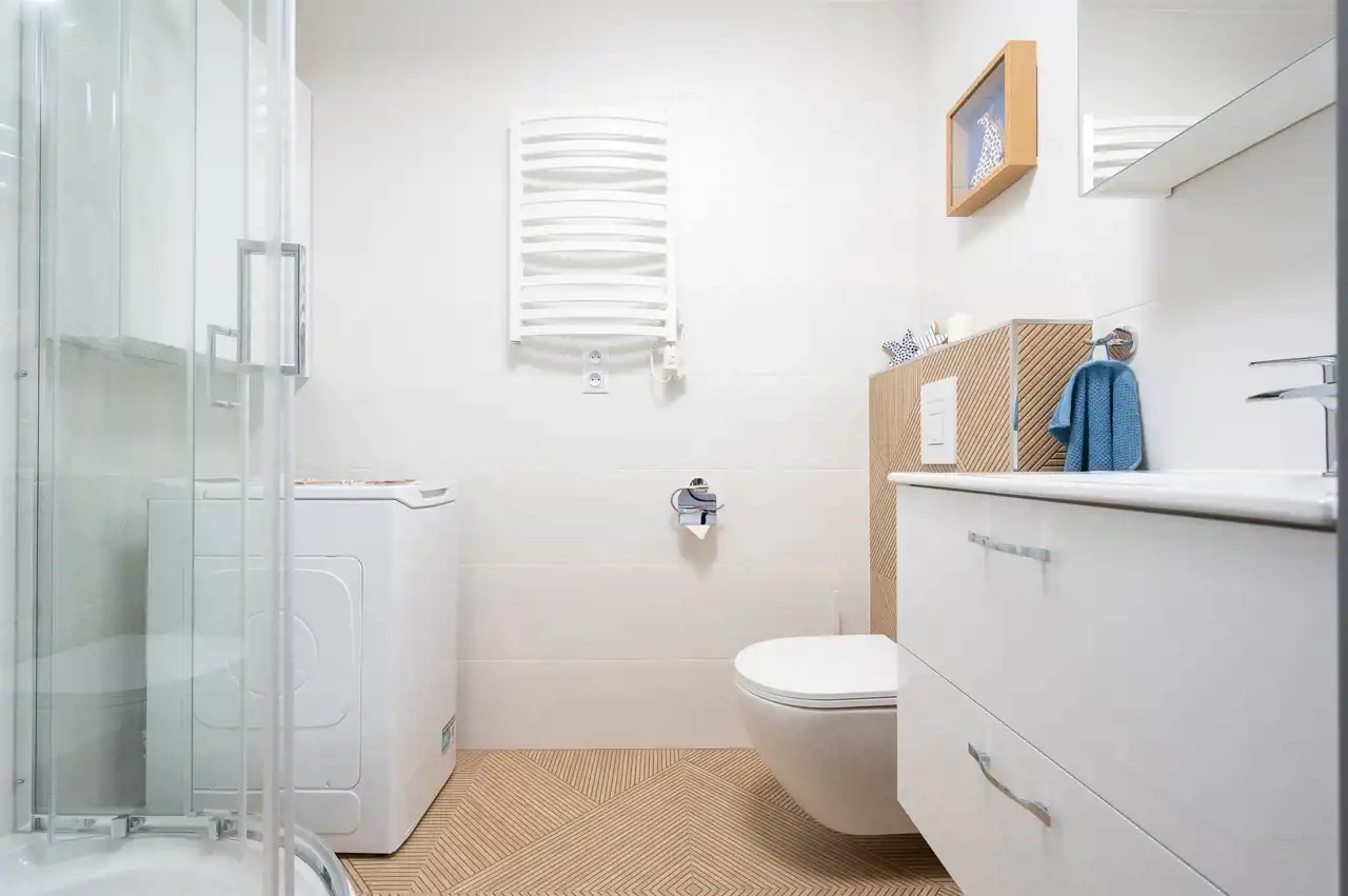 W łazience: kabina prysznicowa, wc, umywalka, pralka, szafka