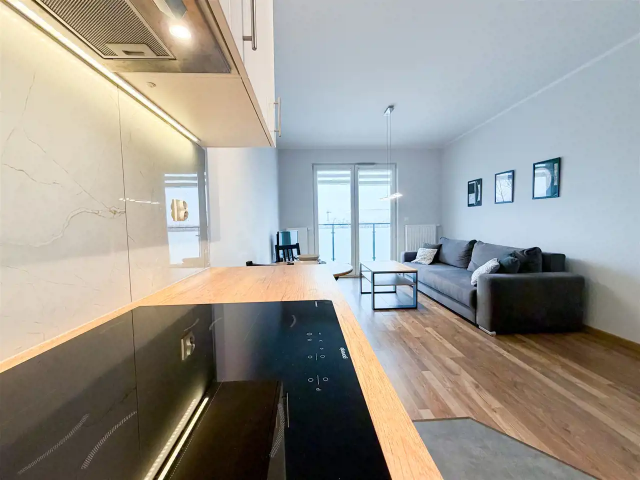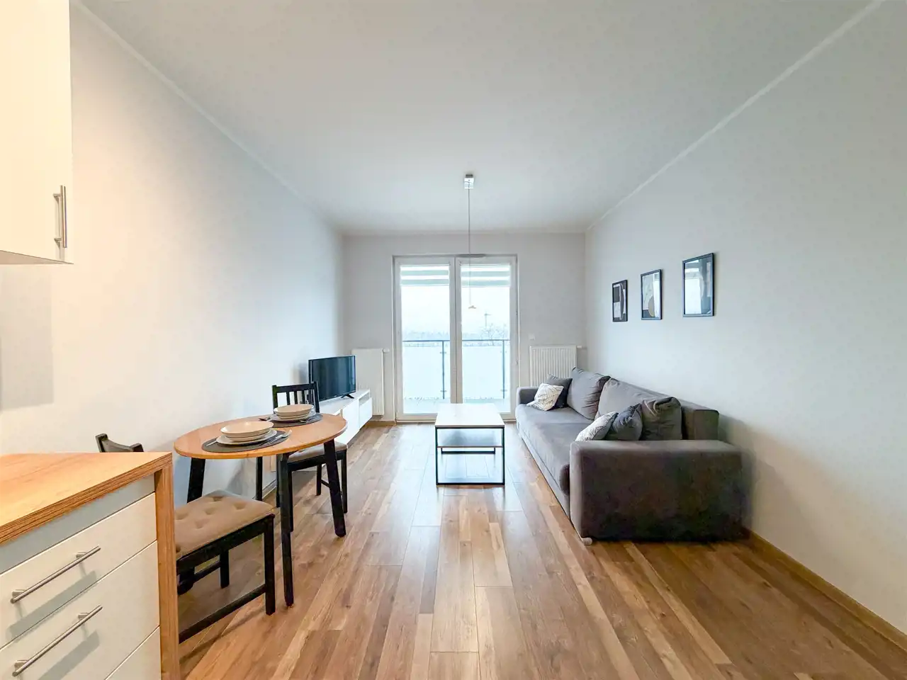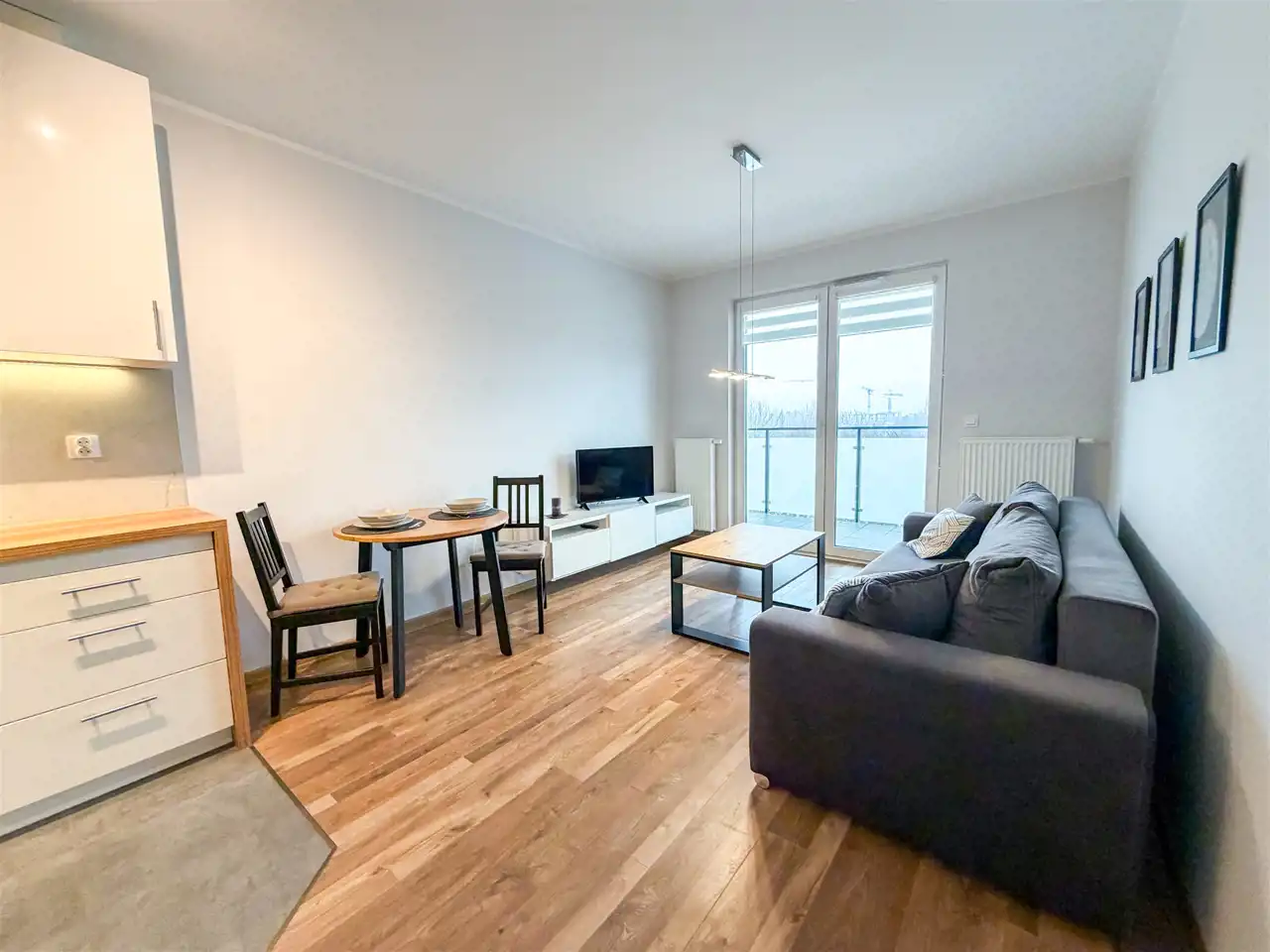 - Salon z aneksem kuchennym: rozkładana kanapa, telewizor, stolik kawowy, stół i krzesła, piekarnik, płyta indukcyjna, zmywarka.