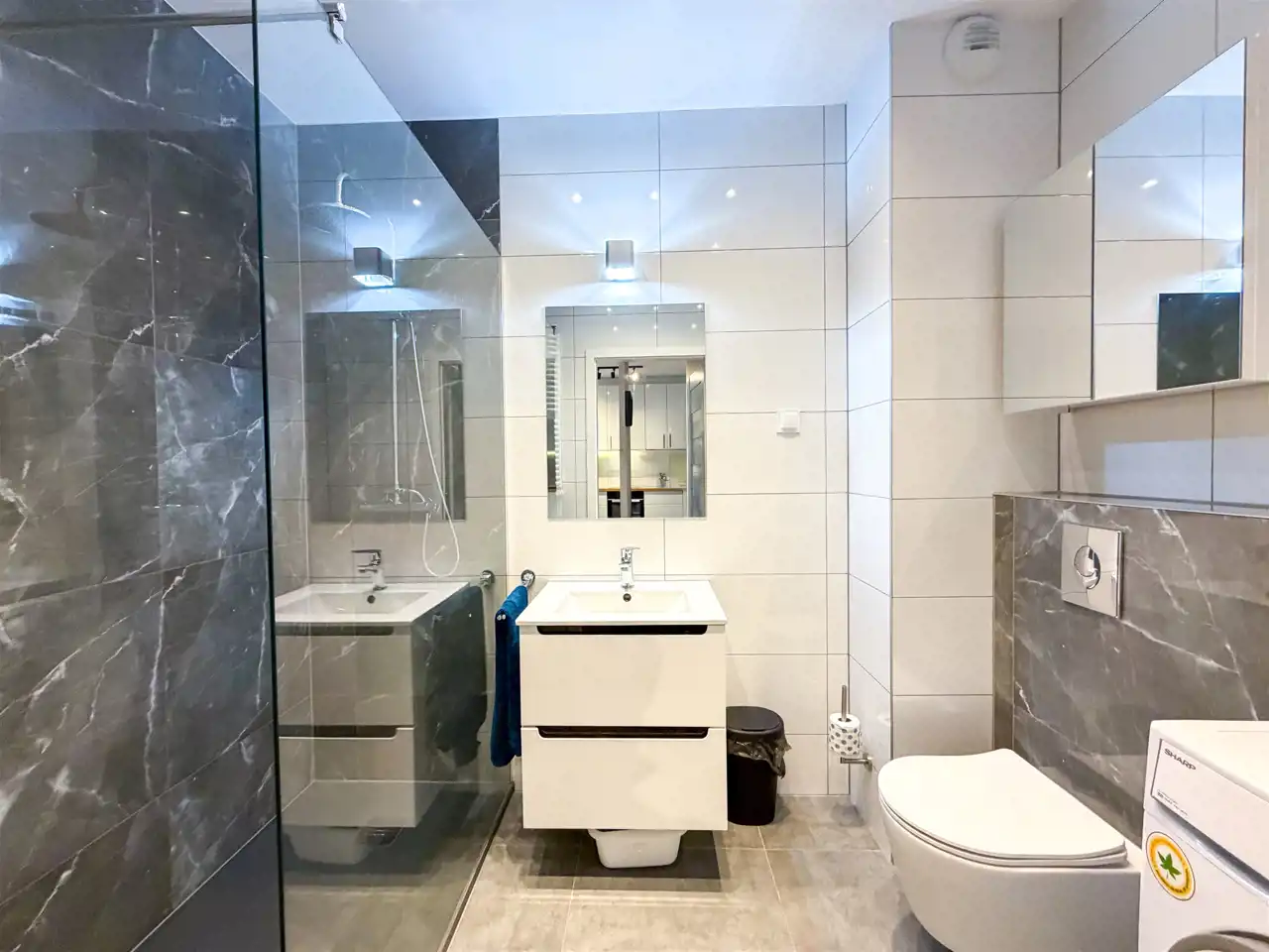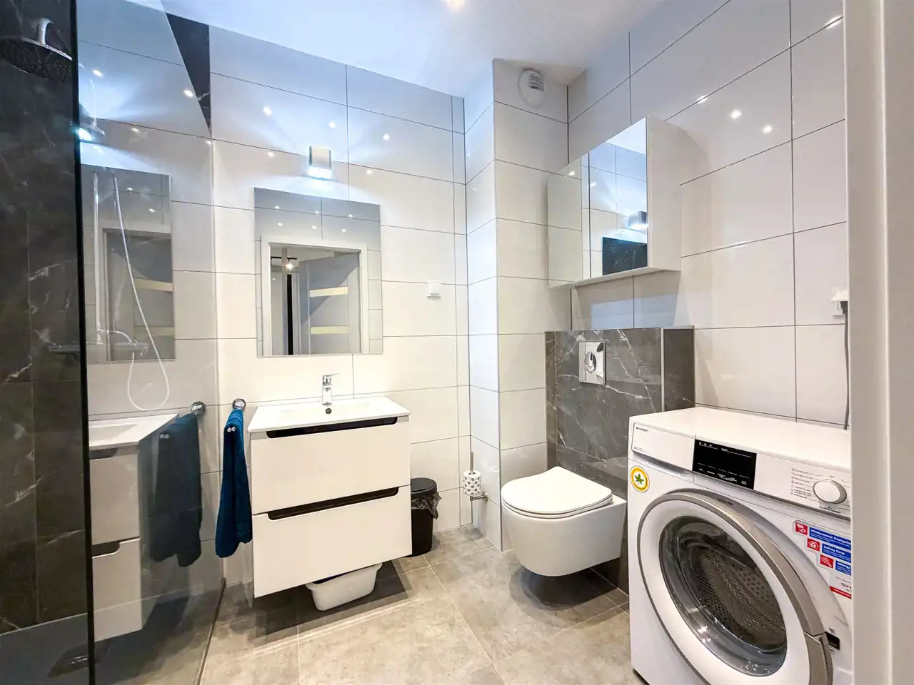 - Łazienka z prysznicem typu walk-in, wc oraz pralką.