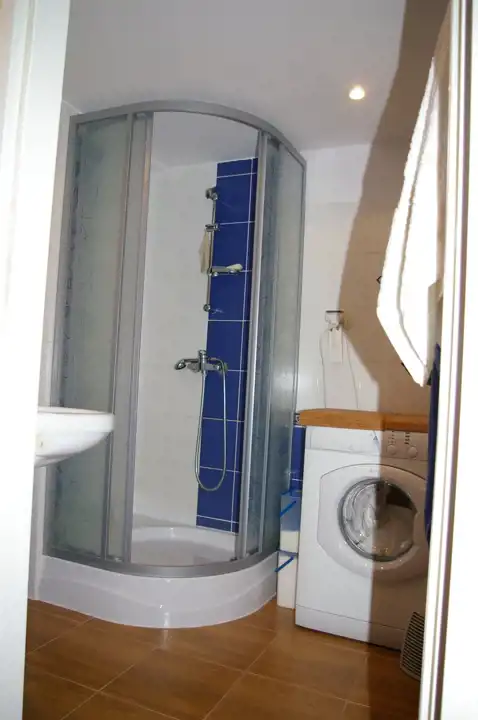- łazienka z kabiną prysznicową, WC, pralka