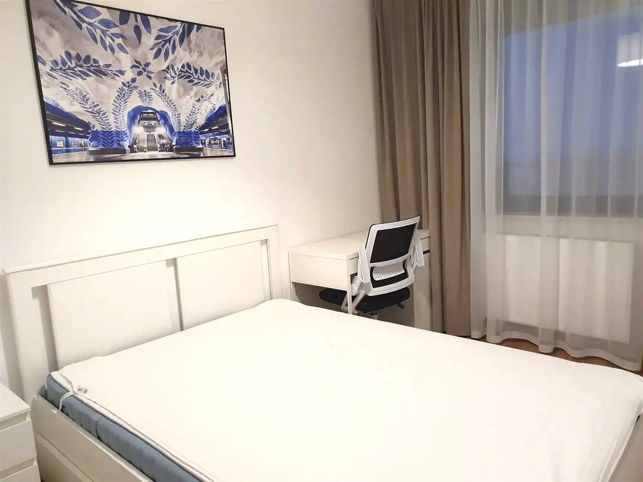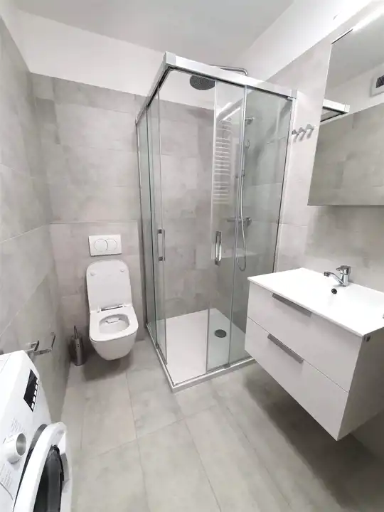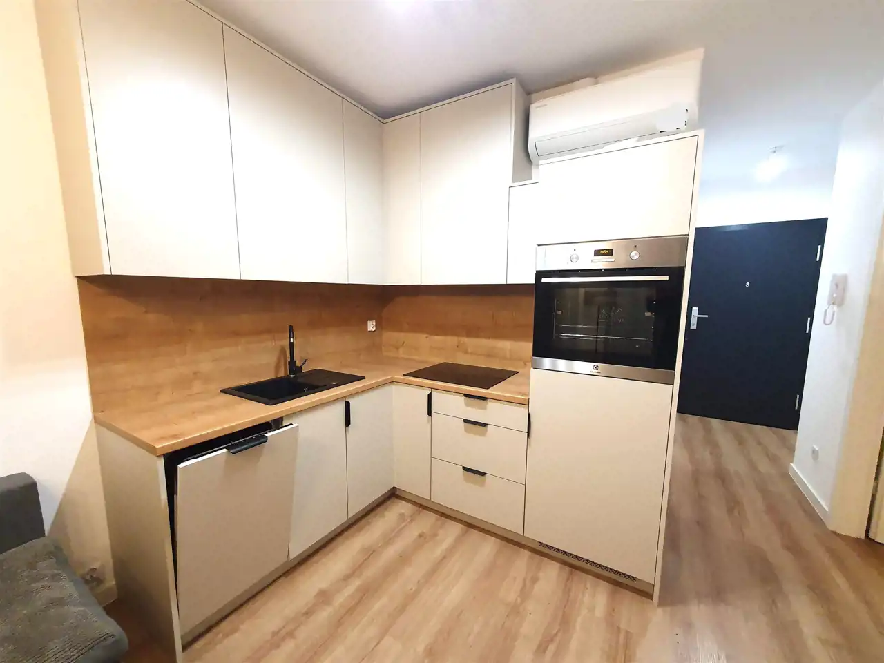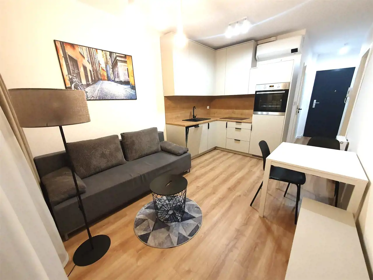 W pełni wyposażone: meble w zabudowie, kanapa rozkladana w salonie, łóżko podwójne w sypialni, pojemna szafa, aneks kuchenny, lodówka z zamrażarką ,zmywarka, piekarnik, łazienka z prysznicem, pralka, balkon. W mieszkaniu zainstalowany jest internet. Dostęp do siłowni, business room-u, rowerowni. Blok monitorowany z ochroną.