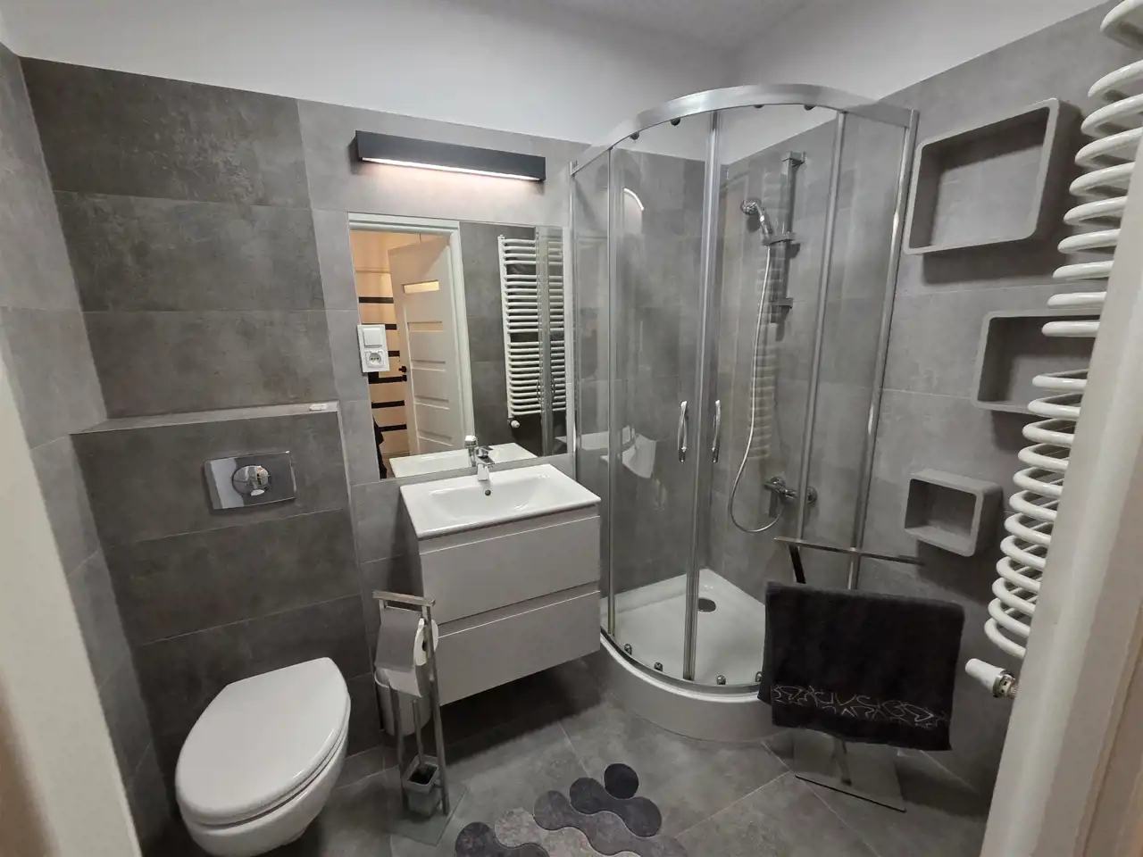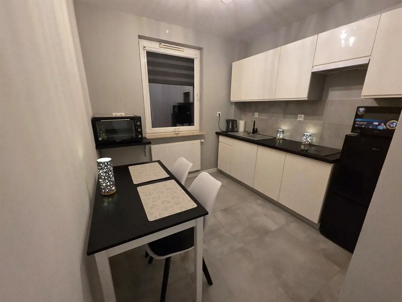 - Oddzielnej kuchni wyposażonej w kompletny sprzęt AGD - nowa lodówka, płyta ceramiczna dwupalnikowa, nowa kuchenka mikrofalowa z funkcją grilla