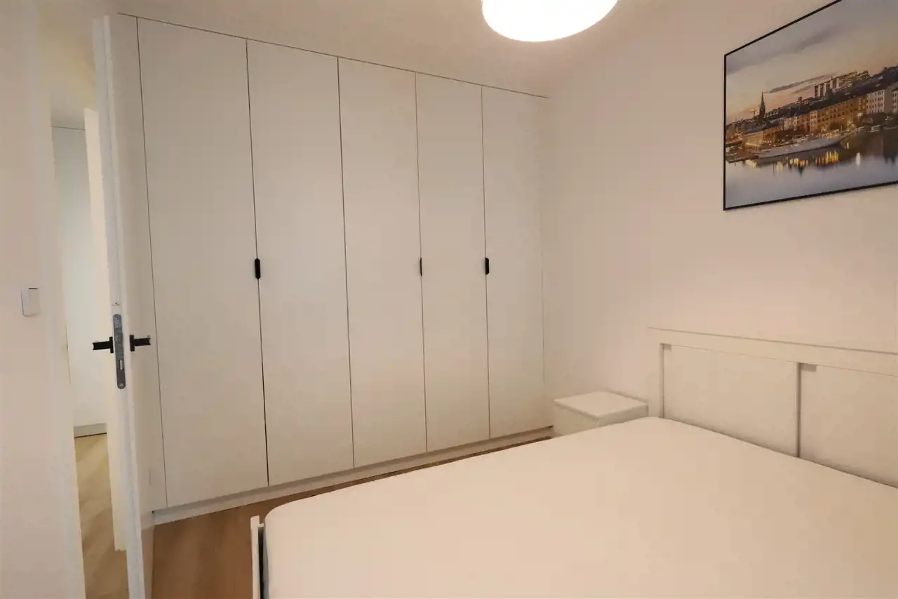 W salonie znajduje się sofa, stolik kawowy, szafka RTV, stół z krzesłami. Kuchnia umeblowana i wyposażona w sprzęty AGD: lodówkę z zamrażarką, płytę indukcyjną, piekarnik i zmywarkę. W sypialni znajduje się łóżko dwu osobowe, szafka nocna, pojemna szafa oraz miejsce do pracy (biuro i krzesło). Dodatkowo w przedpokoju duża szafa w zabudowie. W łazience znajduje się pralka.
