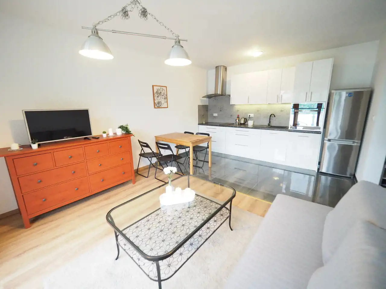 - Salon z aneksem kuchennym (meble w zabudowie, lodówka, płyta grzewcza indukcyjna, piekarnik, okap, zlew, stół, krzesła, zmywarka),