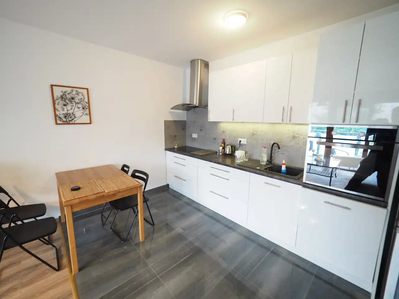 - Living room with kitchenette (built-in furniture, refrigerator, induction hob, oven, extractor hood, sink, table, chairs, dishwasher),