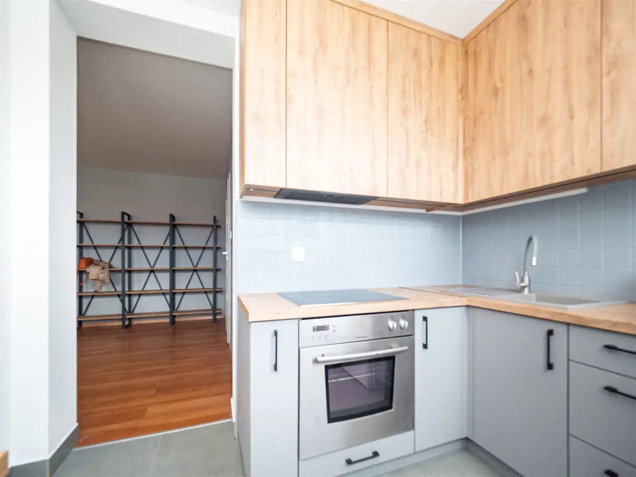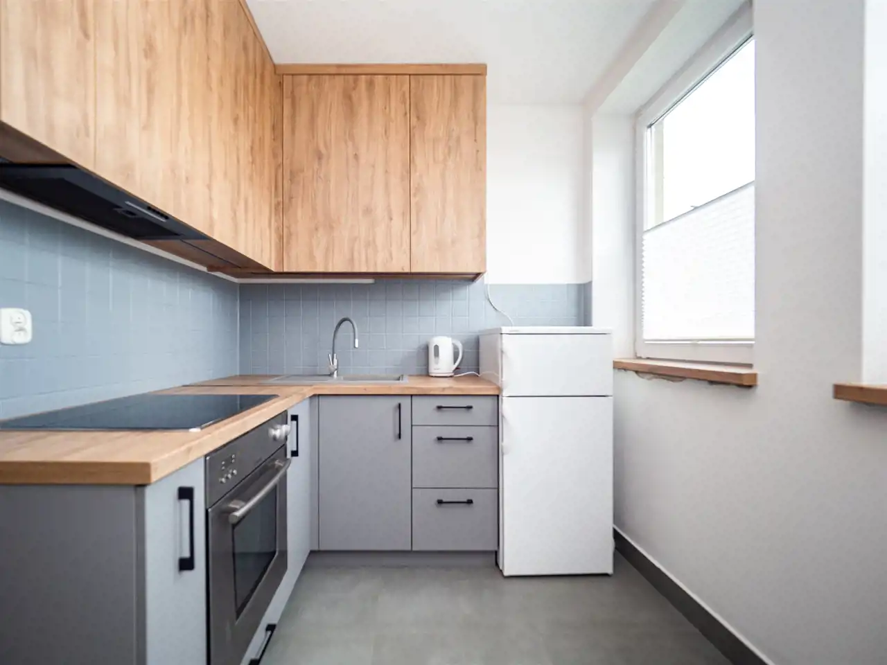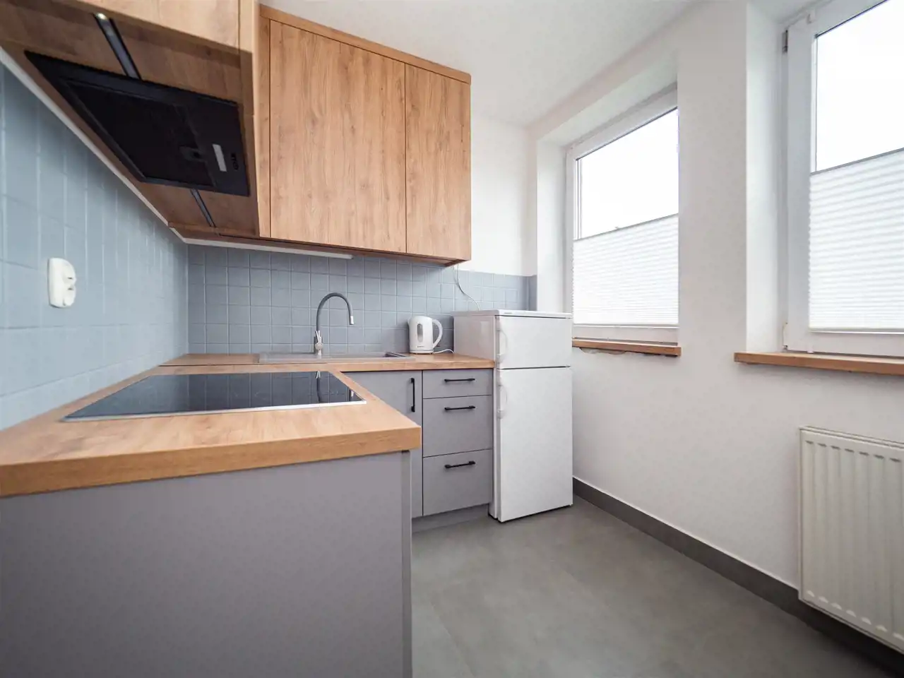 - Kuchnia: meble w zabudowie, lodówka, piekarnik, płyta elektryczna