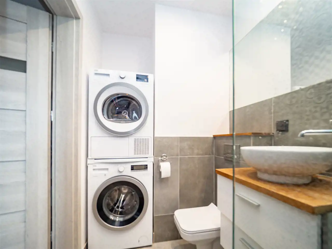 - Łazienka: pralka, suszarka, kabina prysznicowa, WC, umywalka