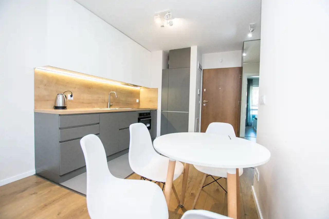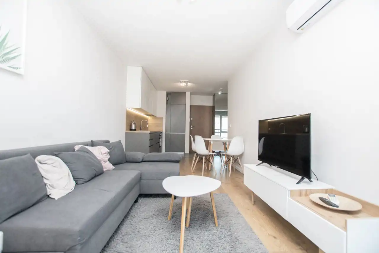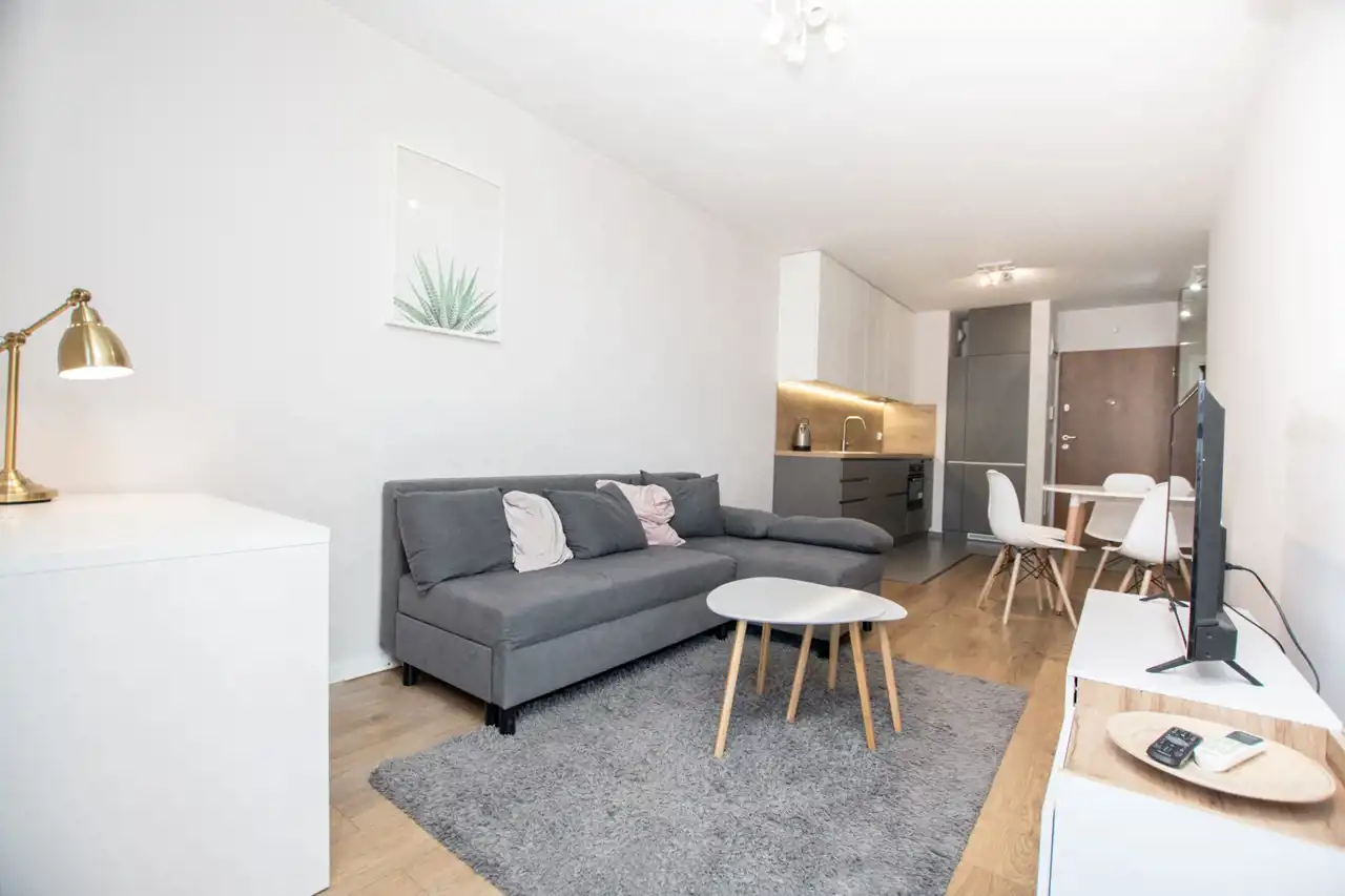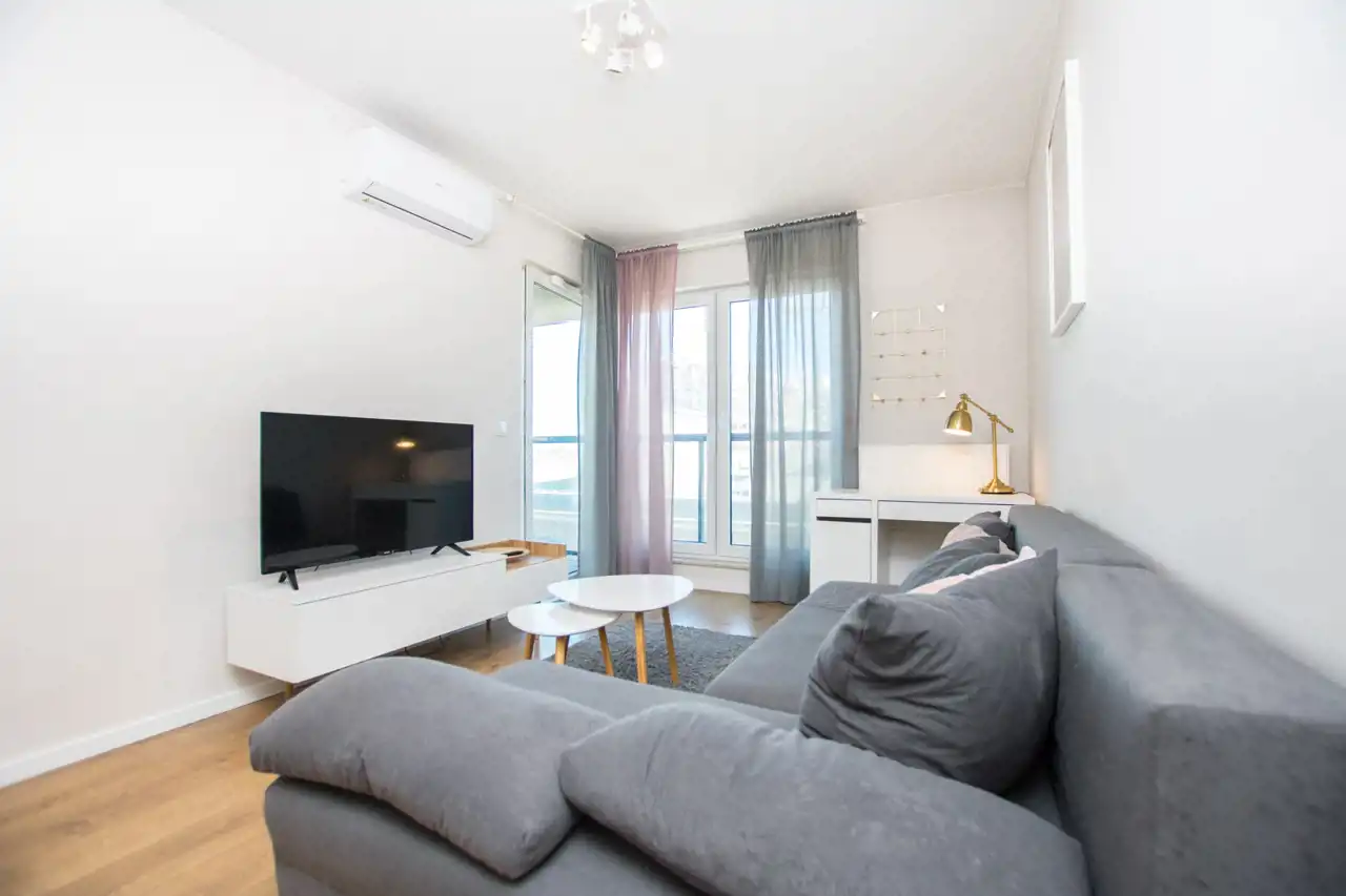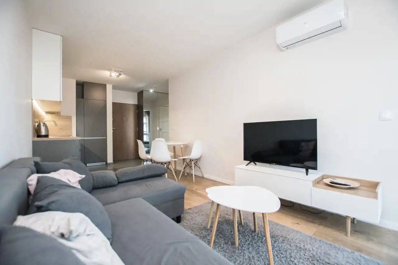 W salonie znajdują się sofa, telewizor i szafka RTV, stoliki kawowe, biurko / toaletka, stół oraz 4 krzesła. Aneks kuchenny jest w pełni wyposażony w sprzęty takie jak: zmywarka, płyta indukcyjna, lodówka z zamrażarką i czajnik. Nowoczesna łazienka wyposażona jest w nową pralkę oraz wannę z parawanem. Sypialnia posiada duże łóżko dwuosobowe, szafę w zabudowie i szafkę nocną. W przedpokoju pojemna szafa z lustrami. Znacznym atutem nieruchomości jest klimatyzacja.