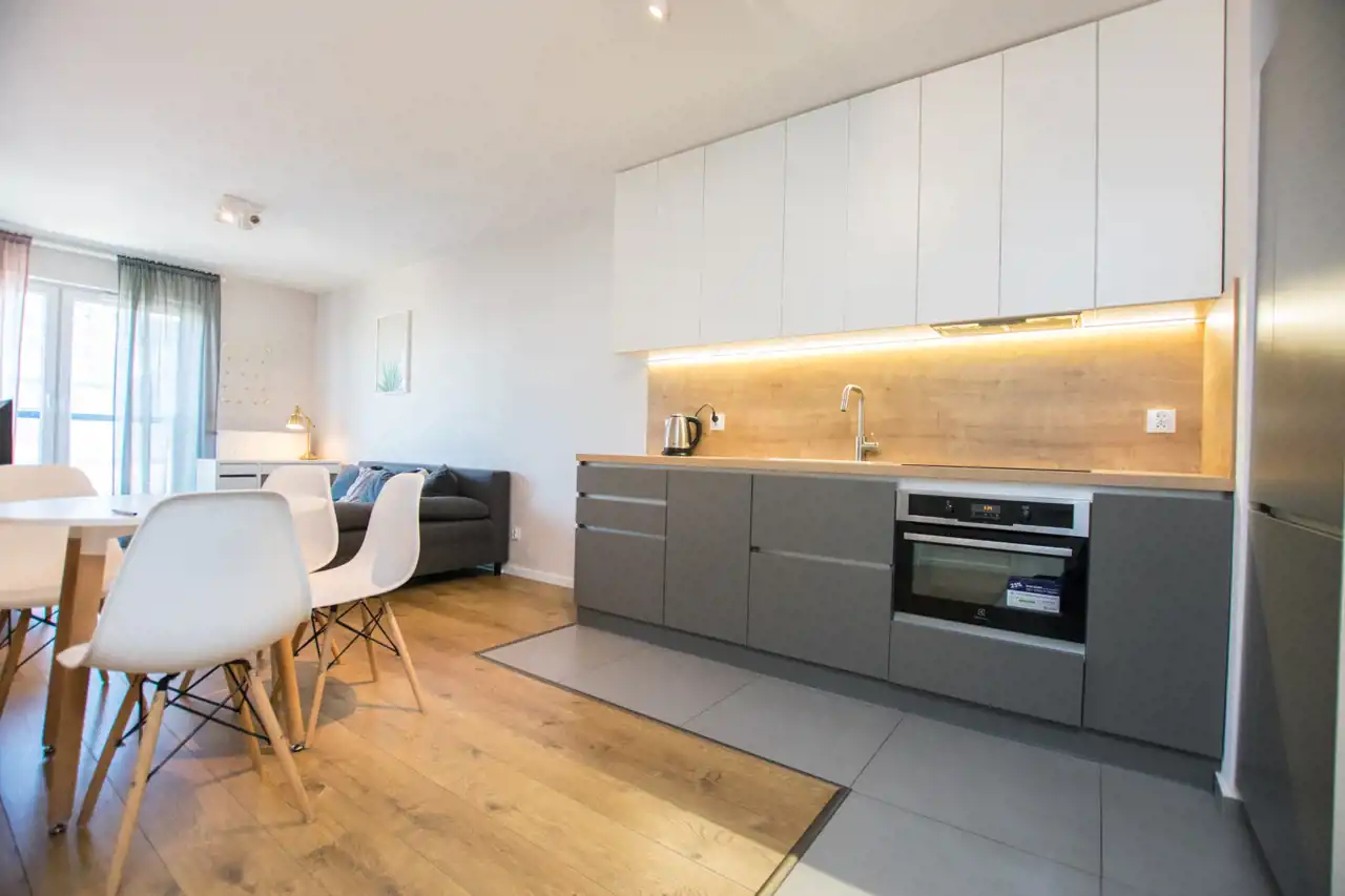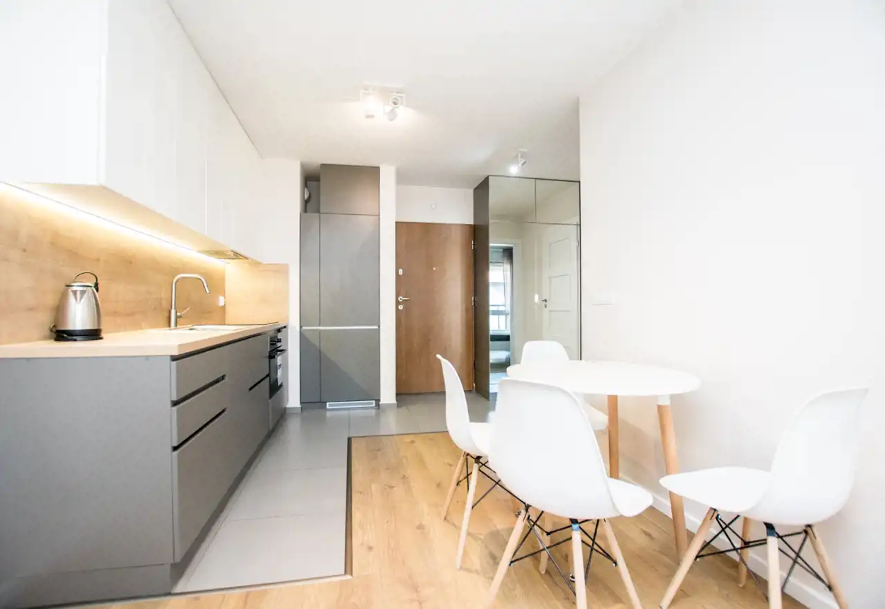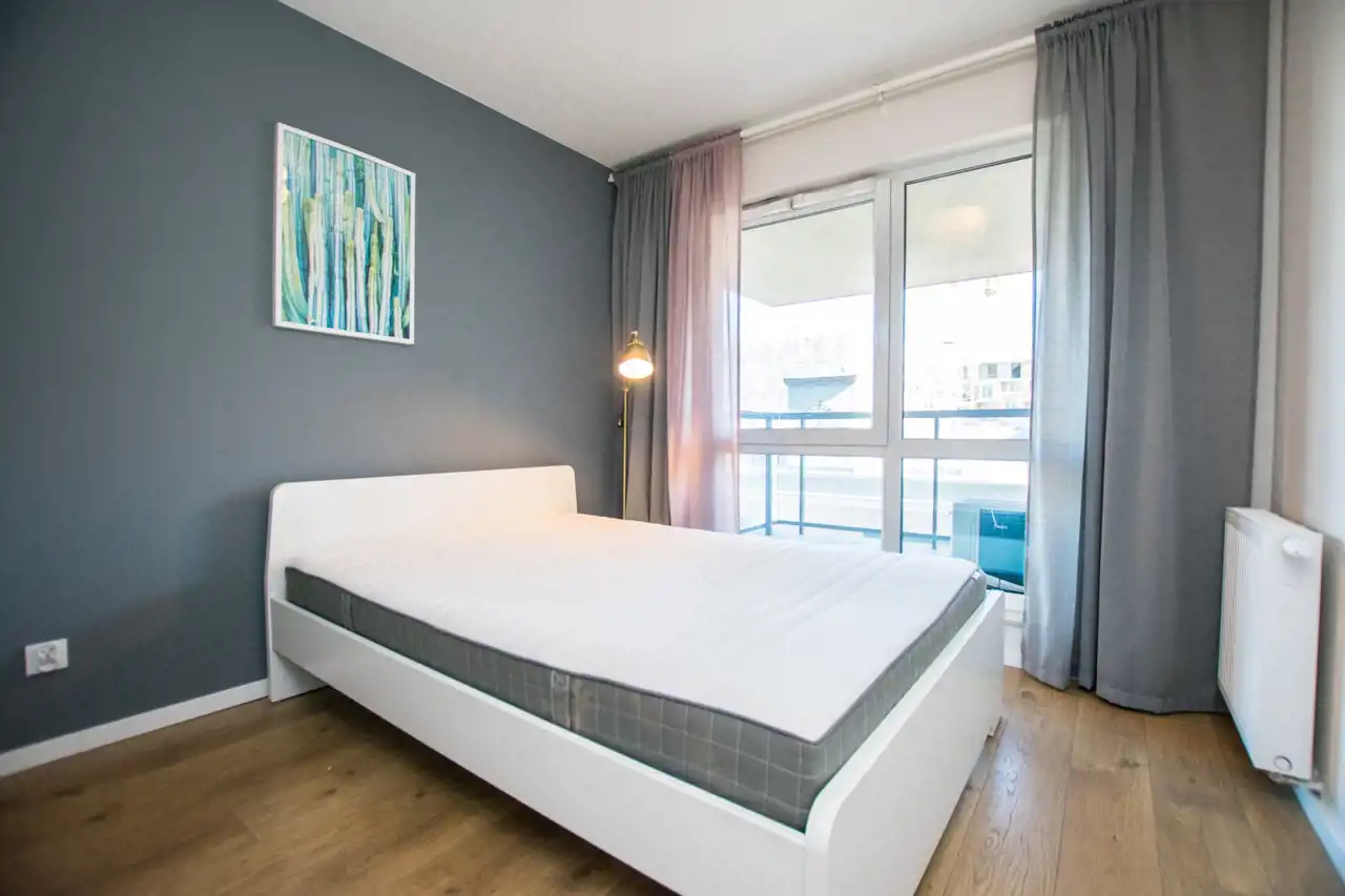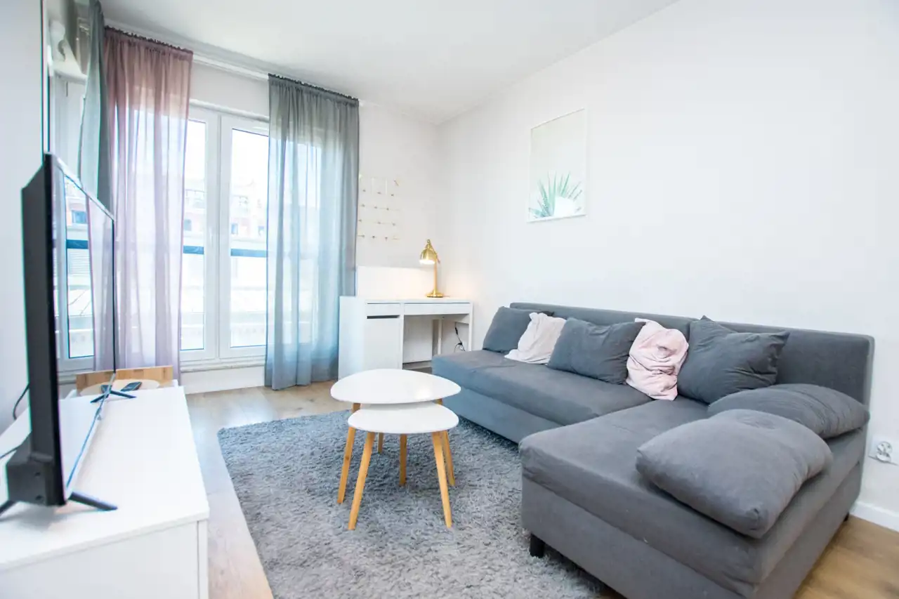 W salonie znajdują się sofa, telewizor i szafka RTV, stoliki kawowe, biurko / toaletka, stół oraz 4 krzesła. Aneks kuchenny jest w pełni wyposażony w sprzęty takie jak: zmywarka, płyta indukcyjna, lodówka z zamrażarką i czajnik. Nowoczesna łazienka wyposażona jest w nową pralkę oraz wannę z parawanem. Sypialnia posiada duże łóżko dwuosobowe, szafę w zabudowie i szafkę nocną. W przedpokoju pojemna szafa z lustrami. Znacznym atutem nieruchomości jest klimatyzacja.