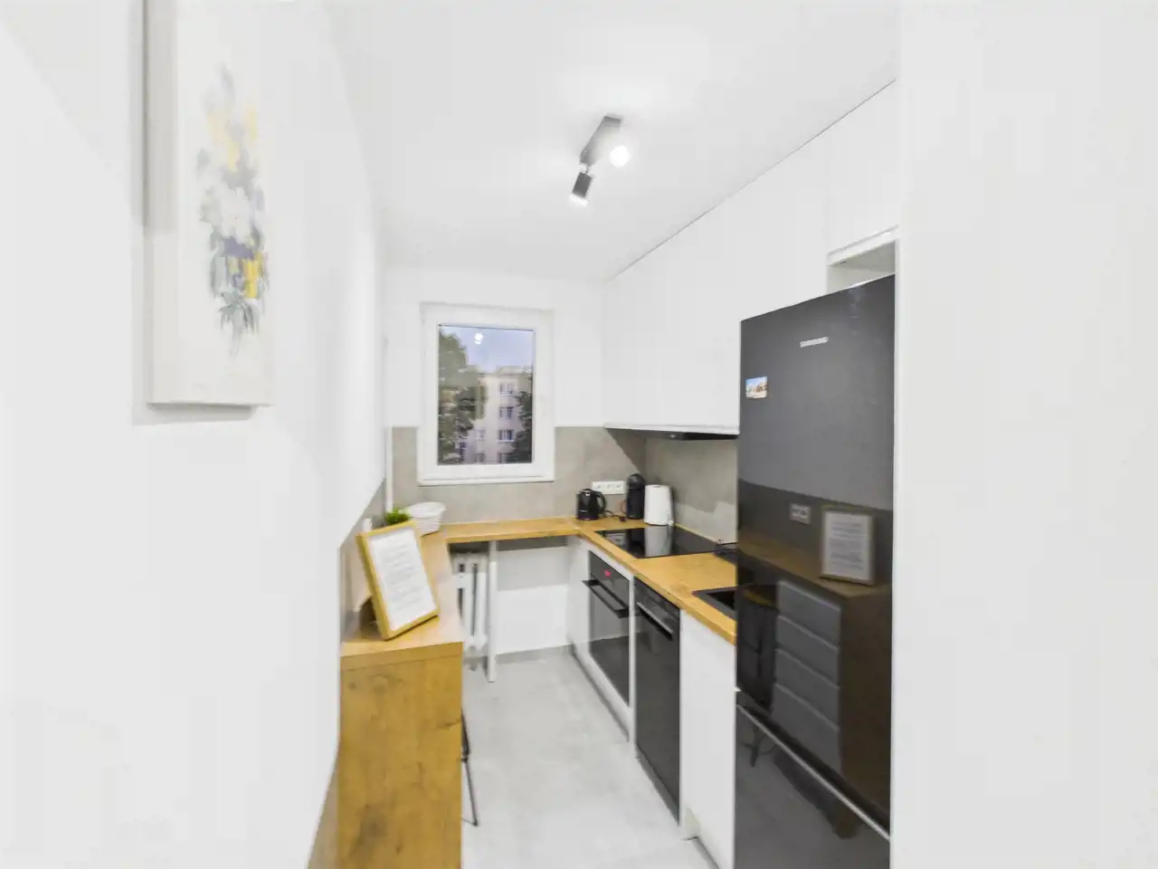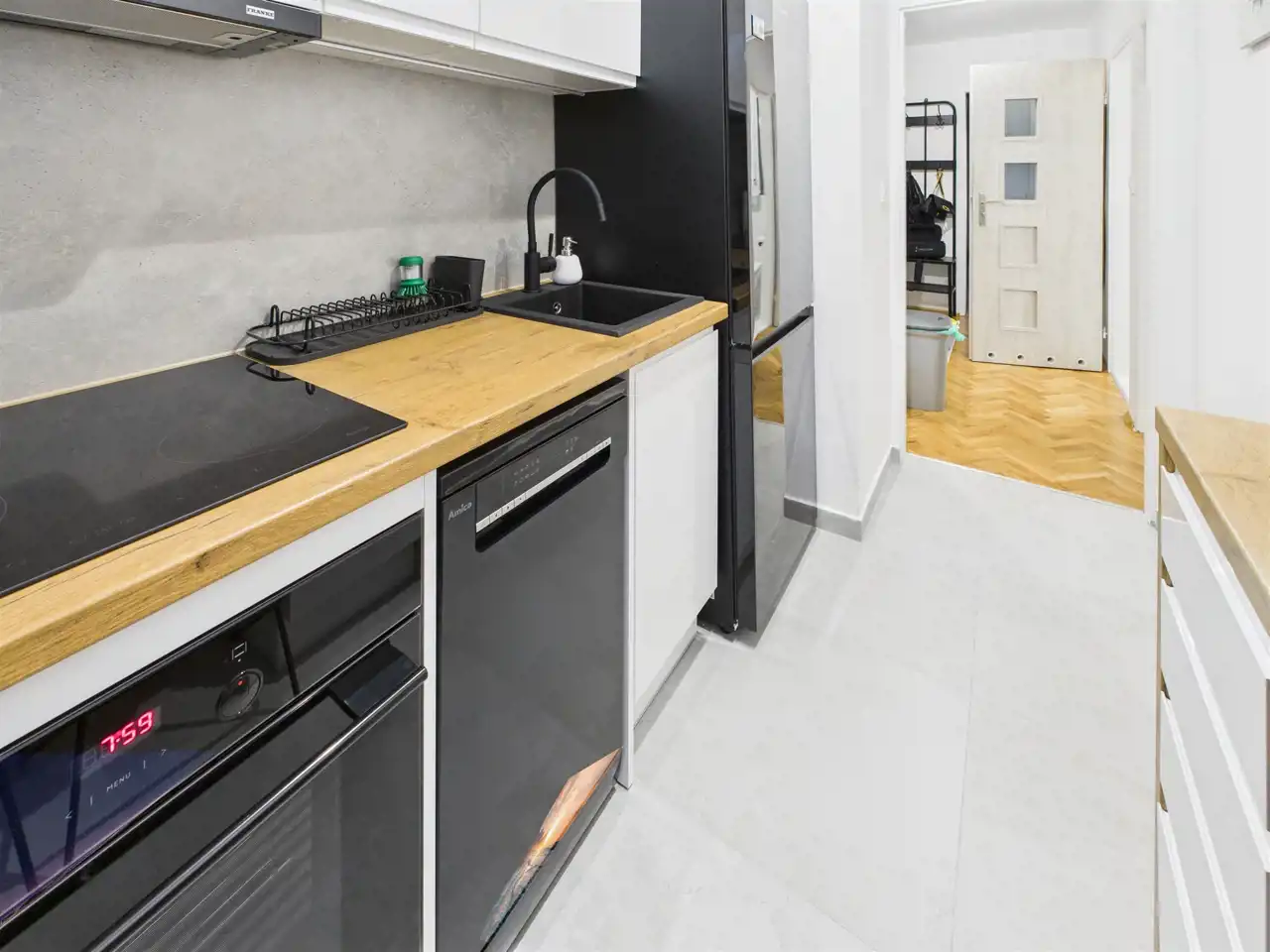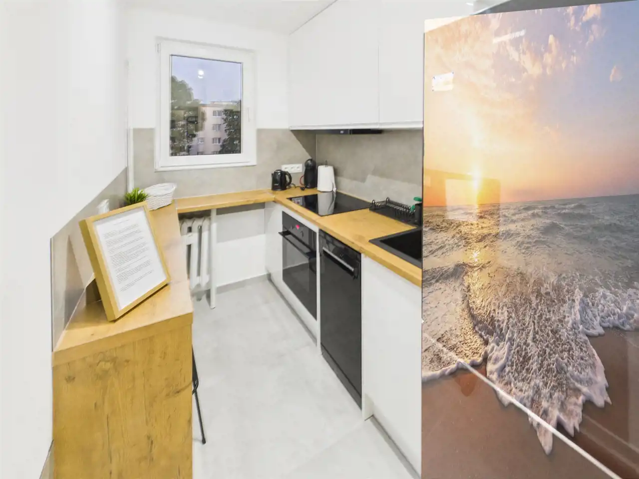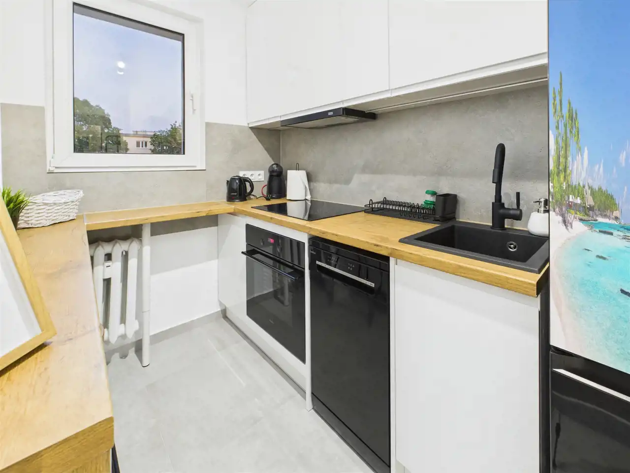 - osobna kuchnia w pełni wyposażona (m.in.: płyta indukcyjna, zmywarka, lodówka z zamrażalką, czajnik, ekspres do kawy)