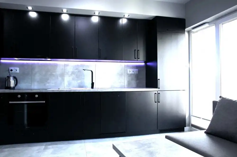 - living room with a kitchenette (dishwasher, washing machine, induction hob, extractor hood, fridge-freezer)