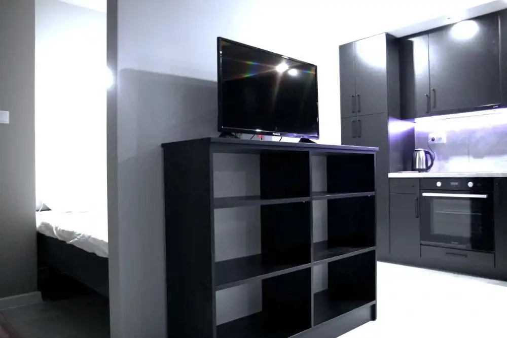 - salon z aneksem kuchennym (zmywarka, pralka, płyta indukcyjna, okap, chłodziarko - zamrażarka)